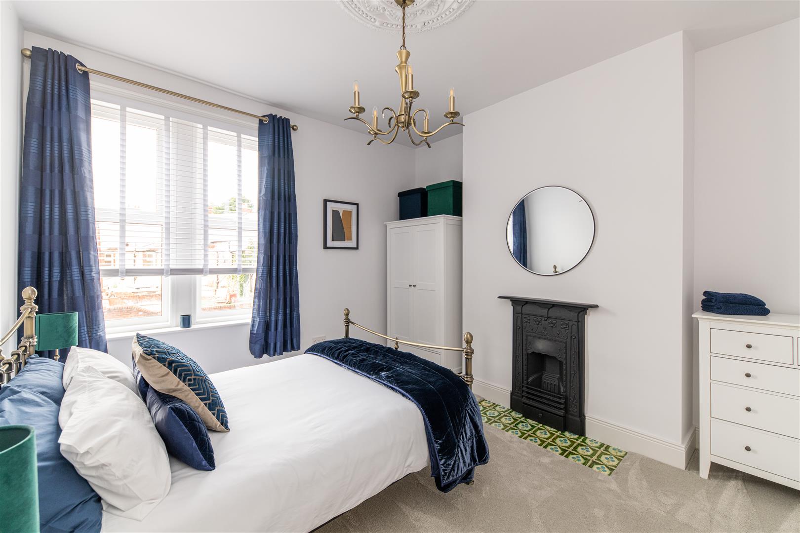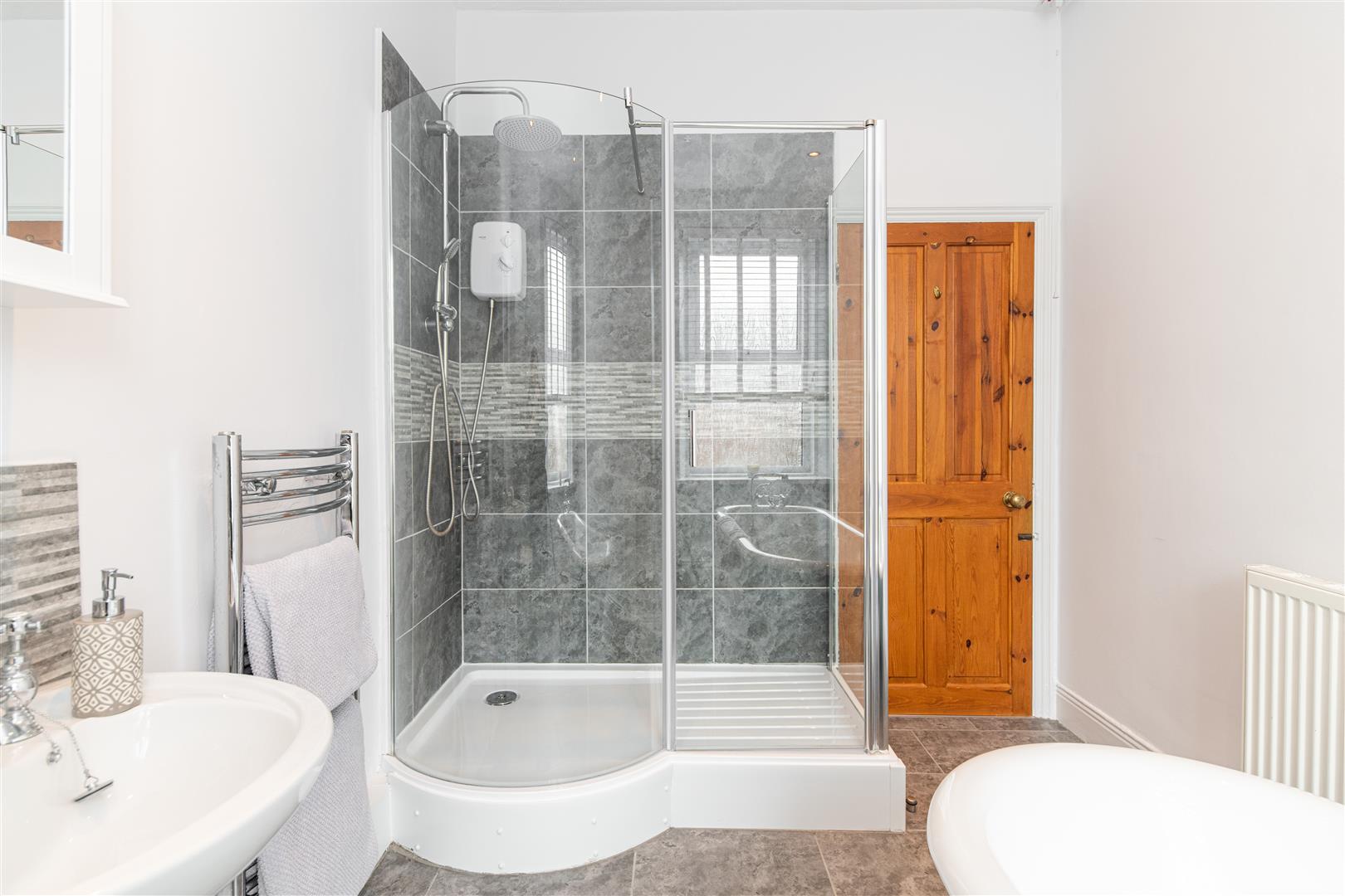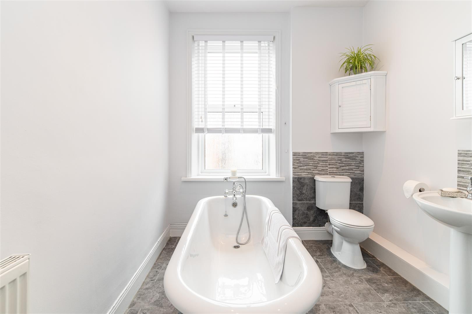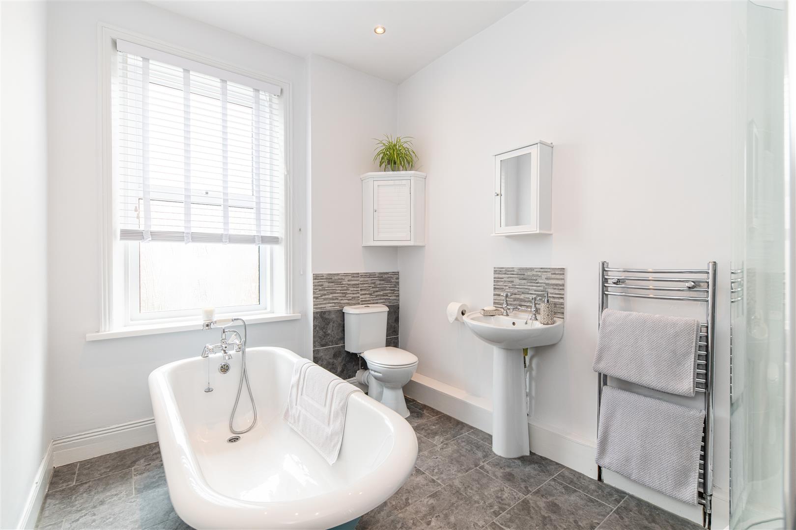 Tucked to the left, the second double bedroom is beautifully light with bright white decor and warm engineered oak flooring, and provides the owner with a variety of uses such as home office, guest bedroom or dressing space. Also located to the front of the property, the primary bedroom is spacious and bright, due to the large feature windows attracting vast amounts of natural light. Finished with fresh carpets, ceiling rose and ornate decorative fireplace, the space retains the period features whilst emulating a minimal design. Across the hallway, the expansive bathroom boasts a contemporary design, with white decor against contrasting slate tiling and bright spotlighting, creating a defined and sleek finish. Furnished with WC, shower cubicle with rainfall head, heated towel rail, pedestal wash basin and roll top free standing bath, the space is completely fit for purpose.