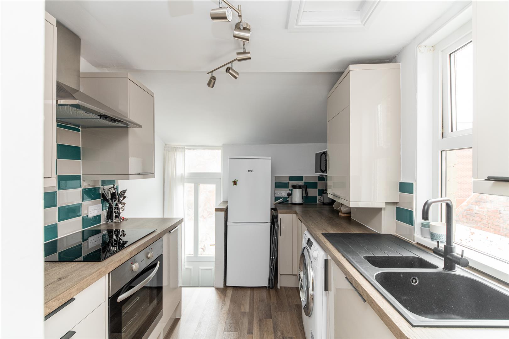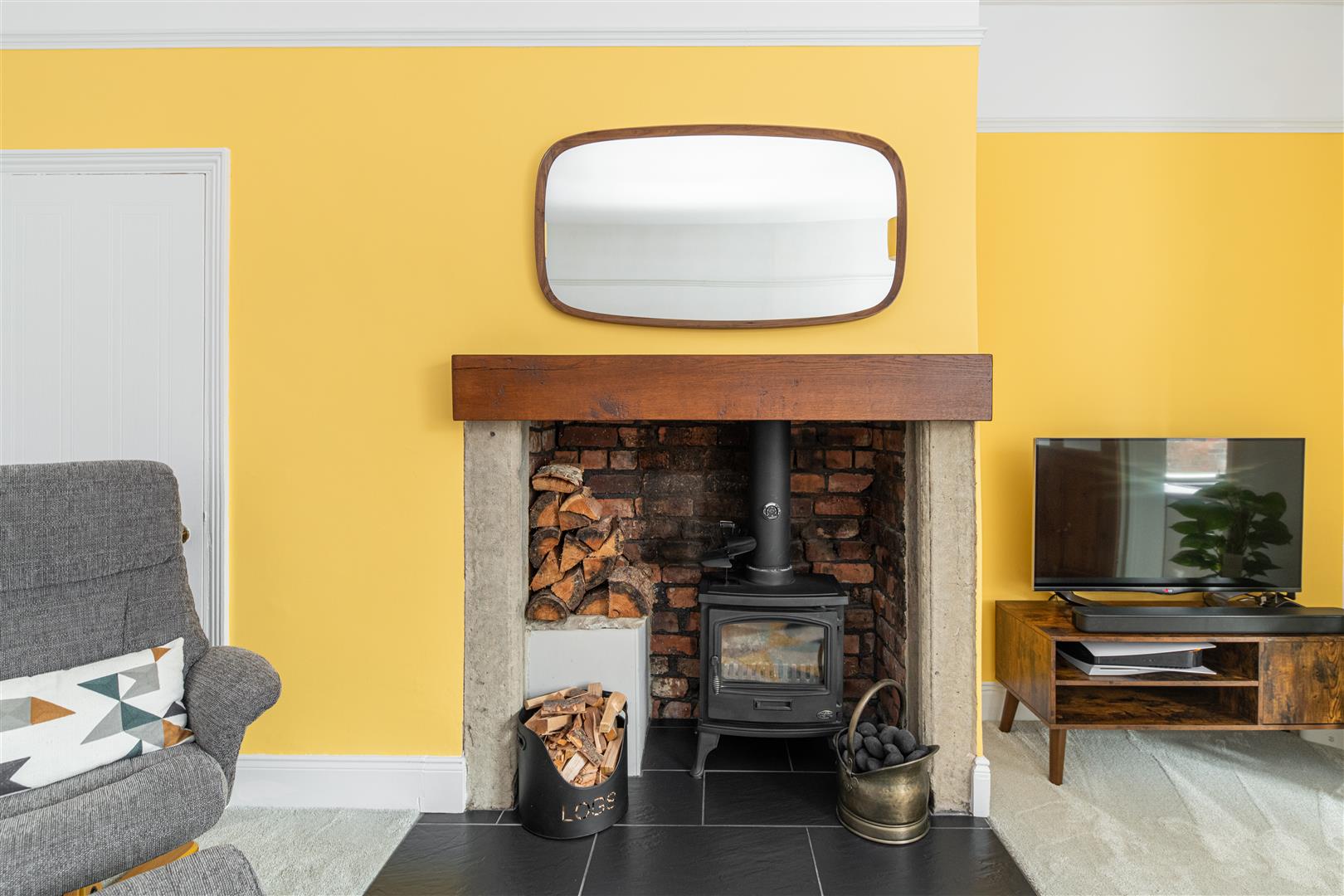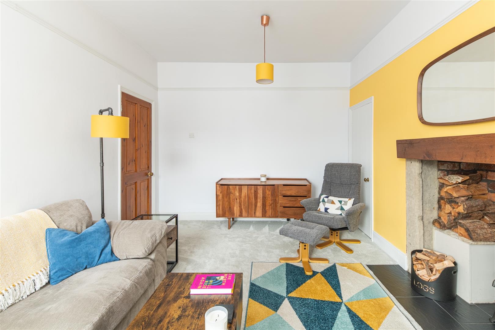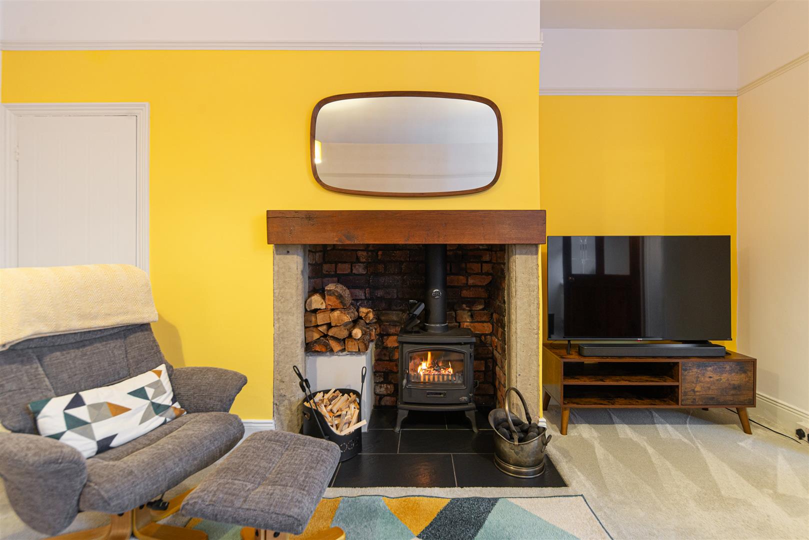 Through to the lounge, the open feature fireplace with brick insert and log burner, creates a real focal point. With vibrant sunshine yellow and cool teal blue hues, the room is lit up with colour, perfectly paired with muted grey carpets and wooden furniture, to create a warm and inviting space. Leading into the kitchen, equipped with taupe high gloss cabinetry, washed wood effect worktops and contrasting teal and taupe metro splash backs, the room offers a contemporary feel and is thoughtfully configured. Fitted with an integrated hob, oven, sink and extractor hood, as well as designated space for other appliances and stair access to the rear yard, functionality is a key feature.