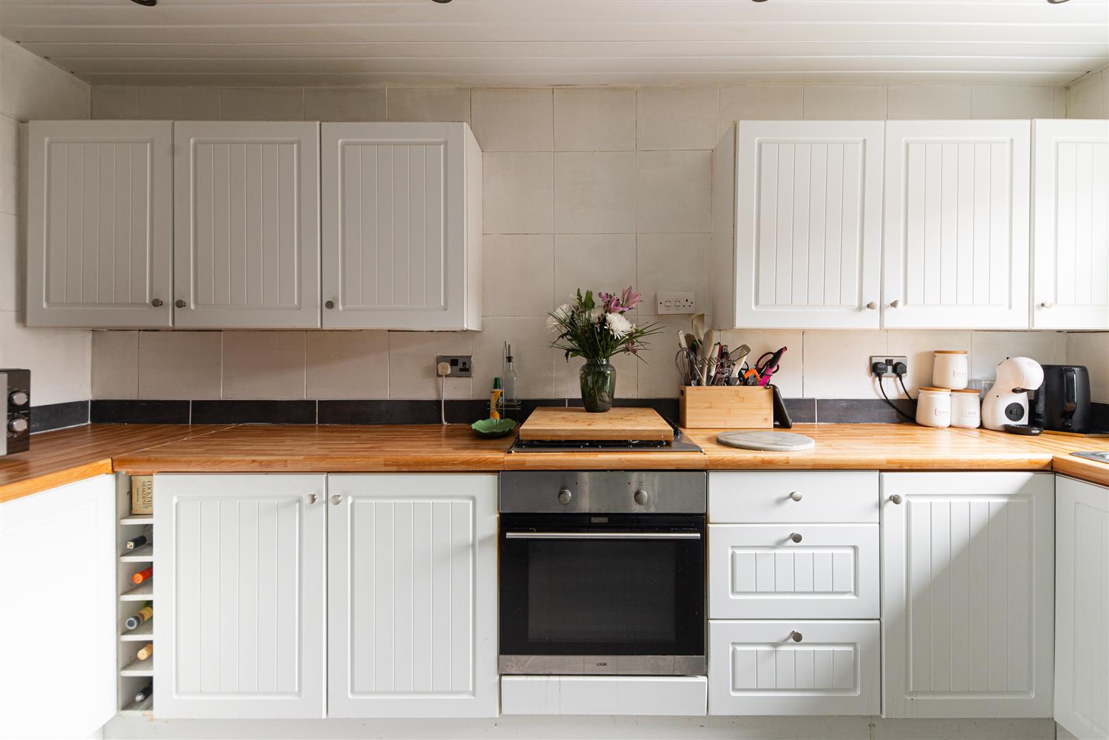 - Modern kitchen with white units, wooden worktops & integrated appliances