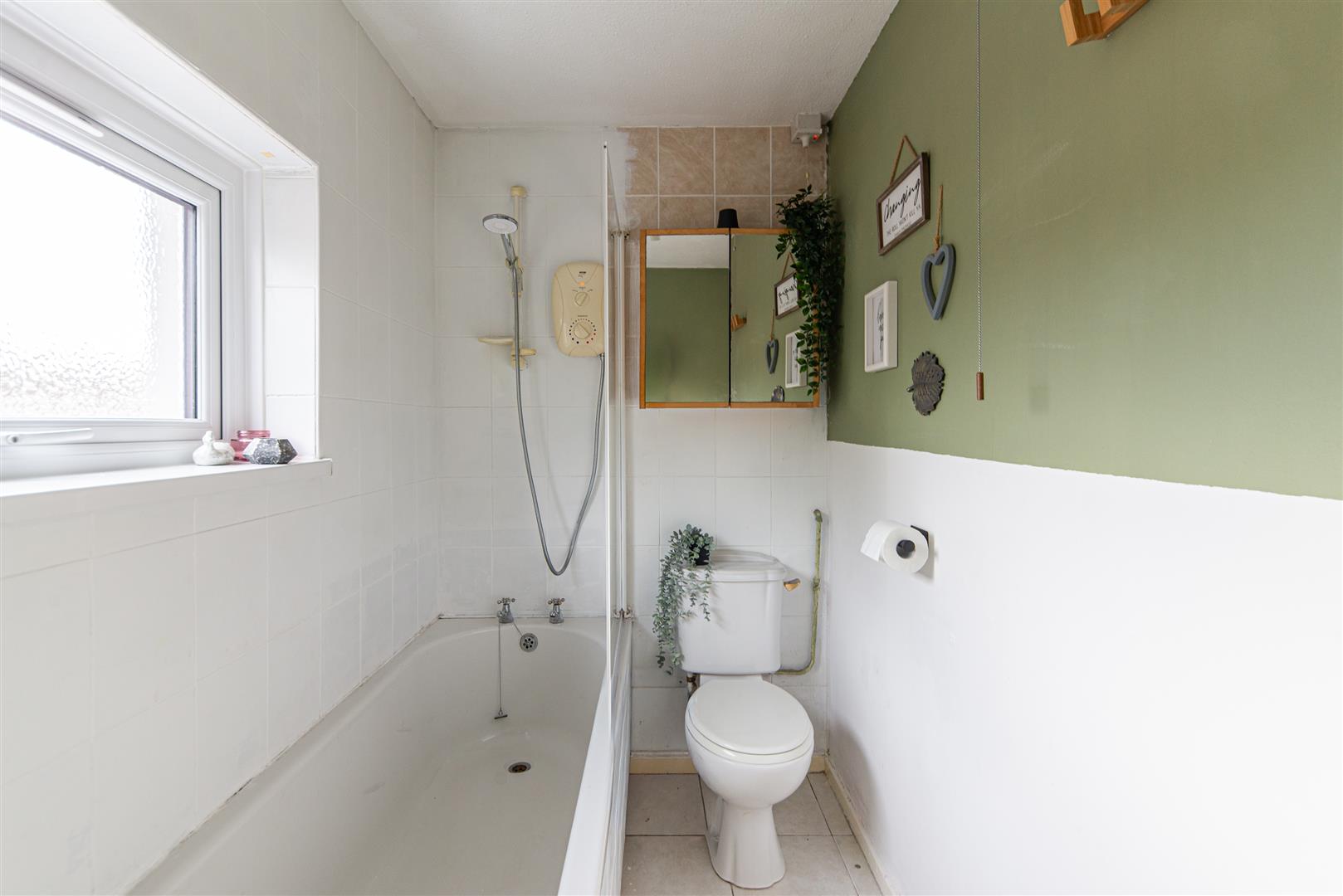 Upstairs, there are three generous double bedrooms, all carpeted, with two benefiting from fitted wardrobes. Large windows throughout flood the home with natural light. The family bathroom includes a fitted bath with shower over, WC, and wash basin.