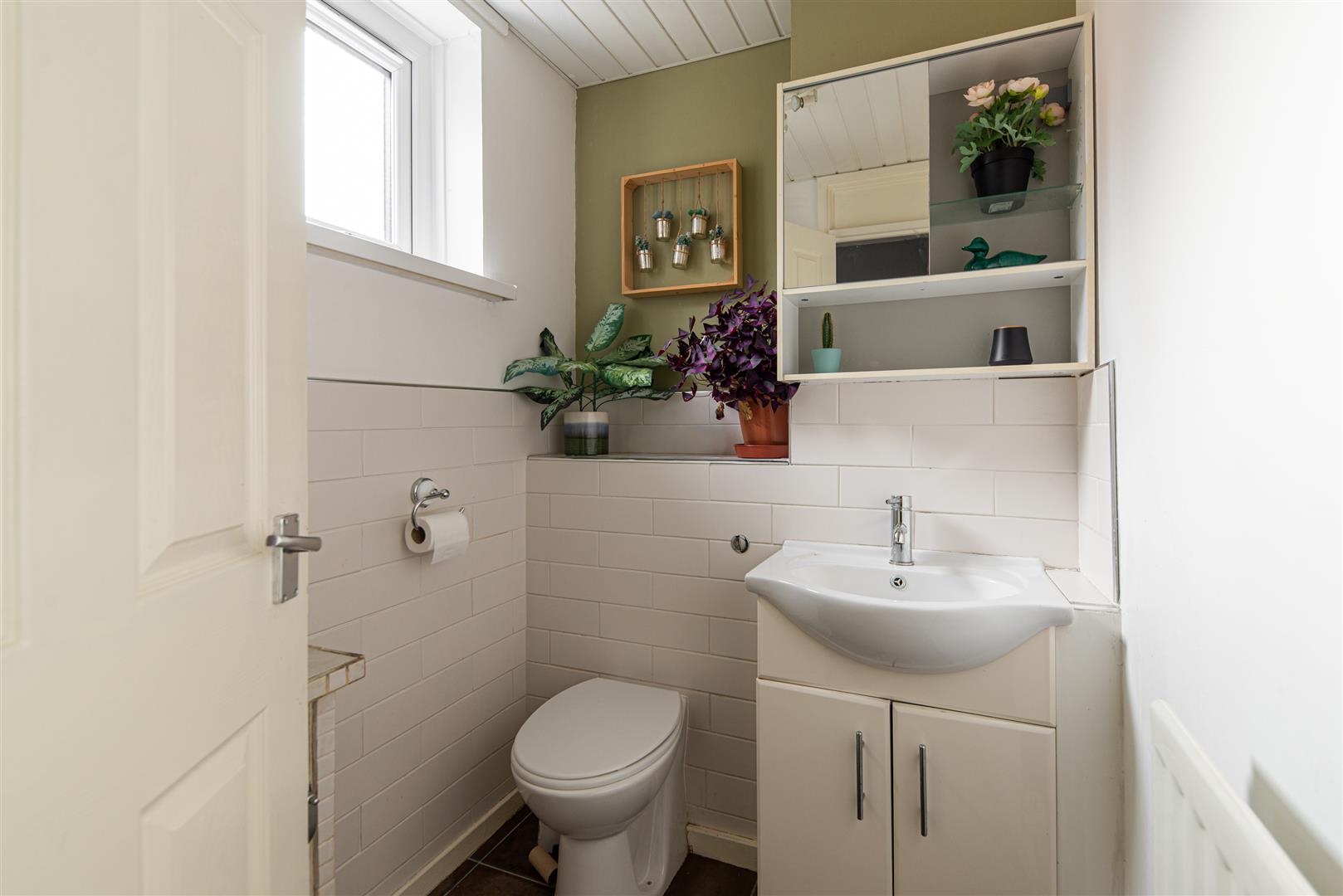 The ground floor features an open-plan living and dining area with attractive wood flooring and patio doors that lead out to the private rear garden, which includes a lawn and patio—ideal for relaxing or entertaining. The contemporary kitchen is fitted with white cabinetry, wooden worktops, an integrated oven with gas hob, and space for a washing machine, dishwasher or dryer, and a freestanding fridge freezer. A convenient downstairs WC with wash basin completes the ground floor.