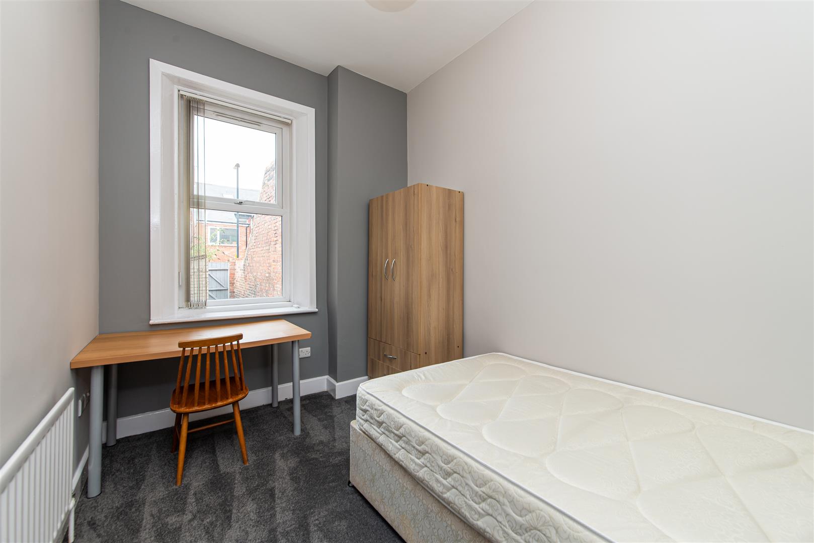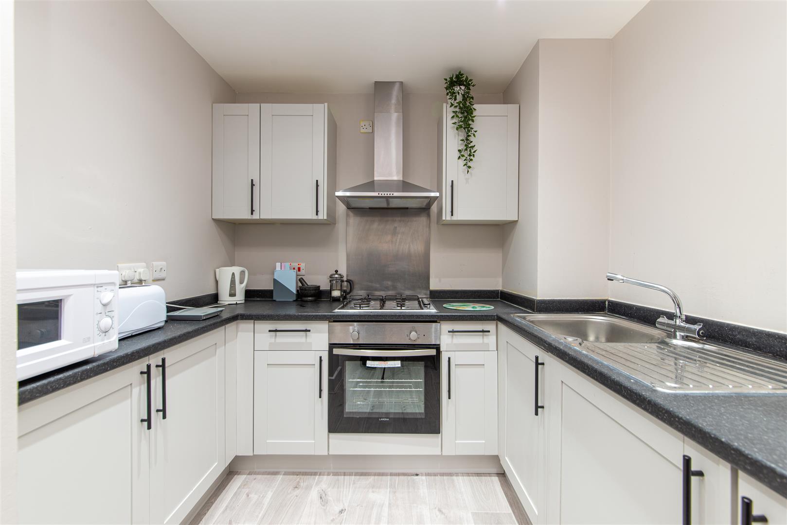 The property has three double bedrooms, each furnished with a desk, chair, wardrobe, double bed and drawers. There's a blend of white and grey decoration throughout, with white woodwork. The shower room is black and white with a corner power shower unit and sink with large mirror. There is a separate toilet under the stairs with a basin. The living room has two sofas and a coffee table with wall mounted LCD TV. There's a modern kitchen with breakfast bar and stools, and appliances provided include a fridge freezer and integrated stainless steel oven, hob and extractor. There's a small utility room with back door leading to the back yard, and a washing machine and dryer provided too. The property is double glazed throughout with an efficient BAXI boiler providing gas central heating.