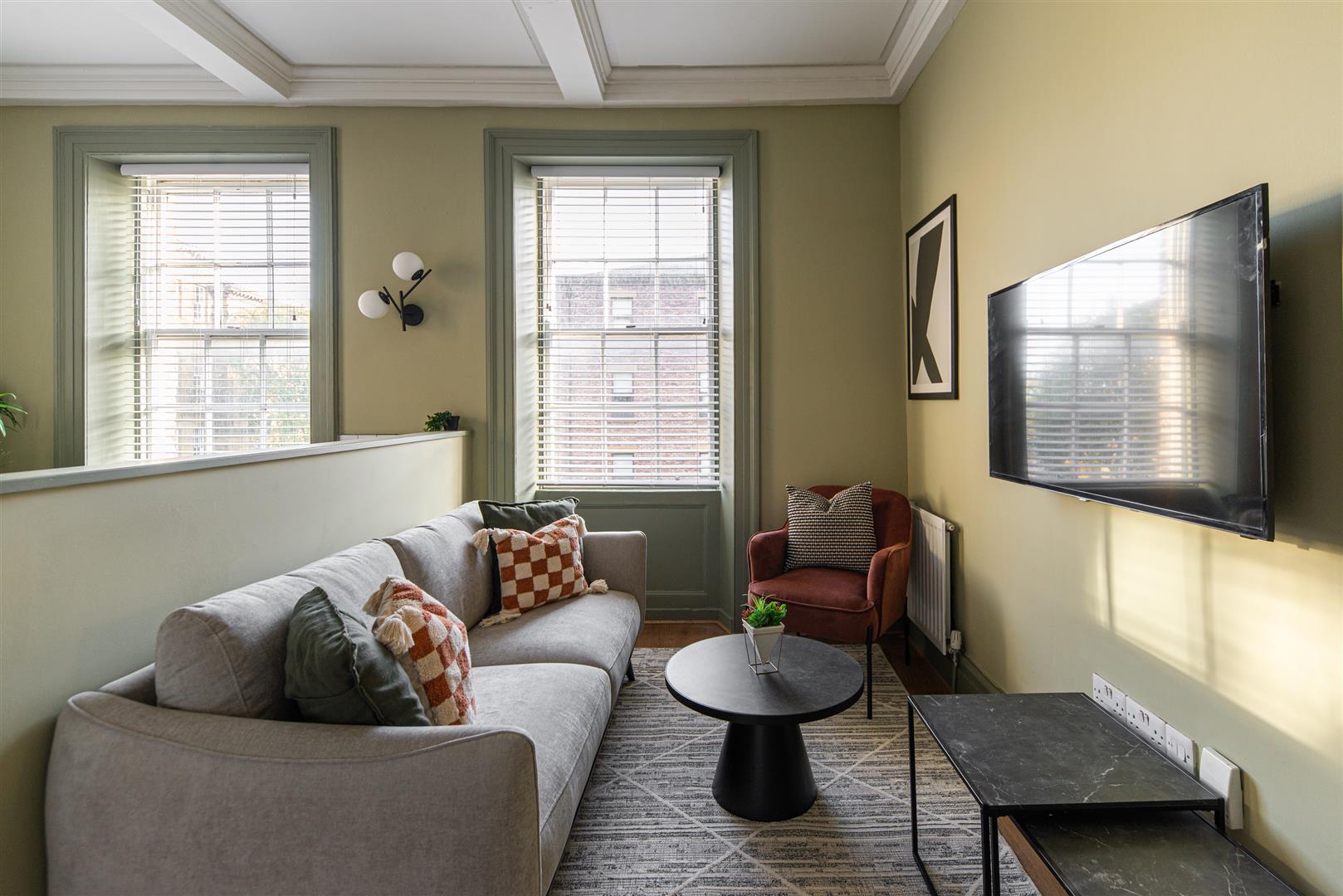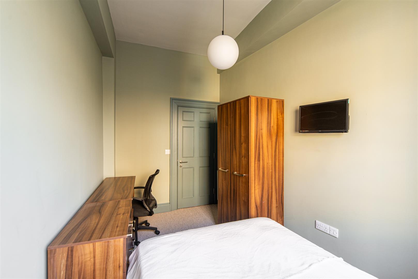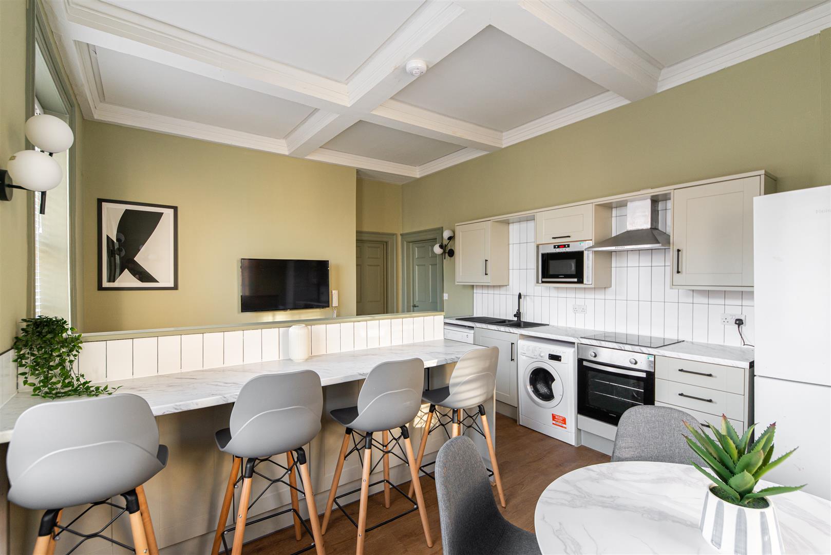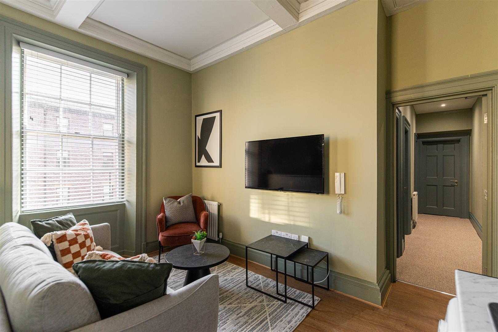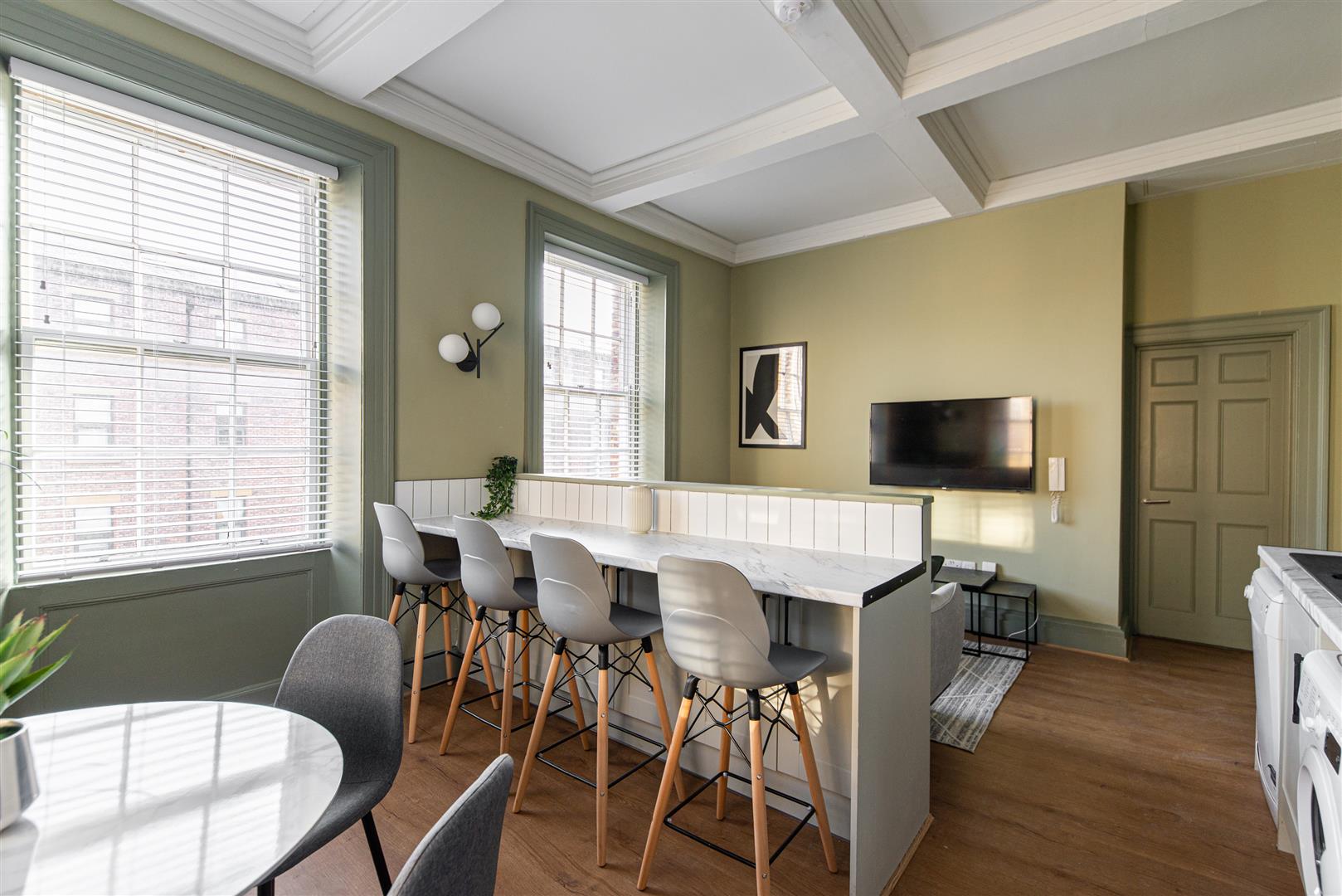 Available Now | £575 per person per month inclusive of all bills Hive Estates presents to the market this brand new modern flat on St James' Street, just a few minutes walk from Newcastle University, the RVI and St James' Park. This fully refurbished furnished property comprises of 5 double bedrooms, one full bathroom, one full shower room and beautiful open plan kitchen living room. All bedrooms are furnished with a double bed, desk, desk chair, ample storage and individual wall-mounted TVs. The shower room and bathroom are both fully tiled and the open plan kitchen is fitted with all appliances including oven, fridge freezer, built-in microwave, washer dryer and dishwasher. There is a large corner sofa, coffee table and wall-mounted TV to the living area, with a dining table and chairs in the corner of the room overlooking the stunning Georgian terrace opposite.