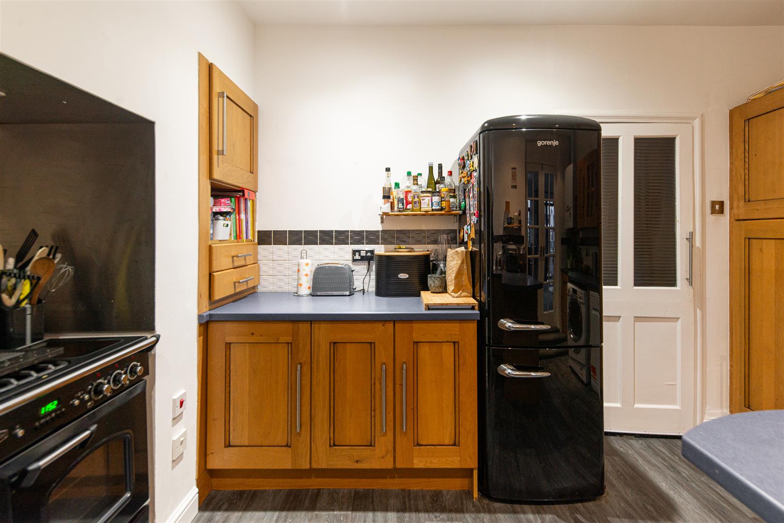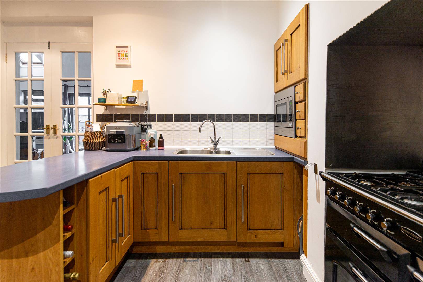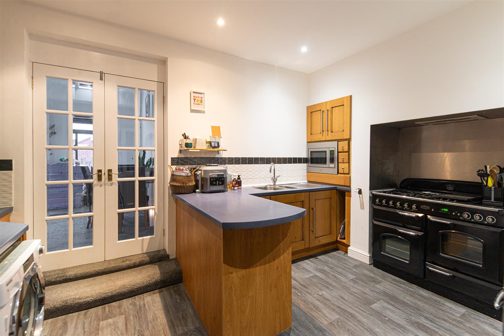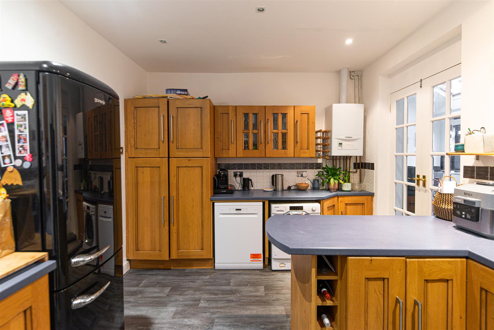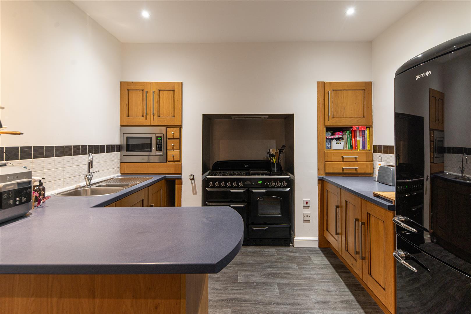 The kitchen offers plentiful cupboard space, a built-in wine rack, integrated microwave, and room for free-standing appliances including a washing machine, dishwasher and fridge-freezer. A substantial double Rangemaster gas oven completes the space.