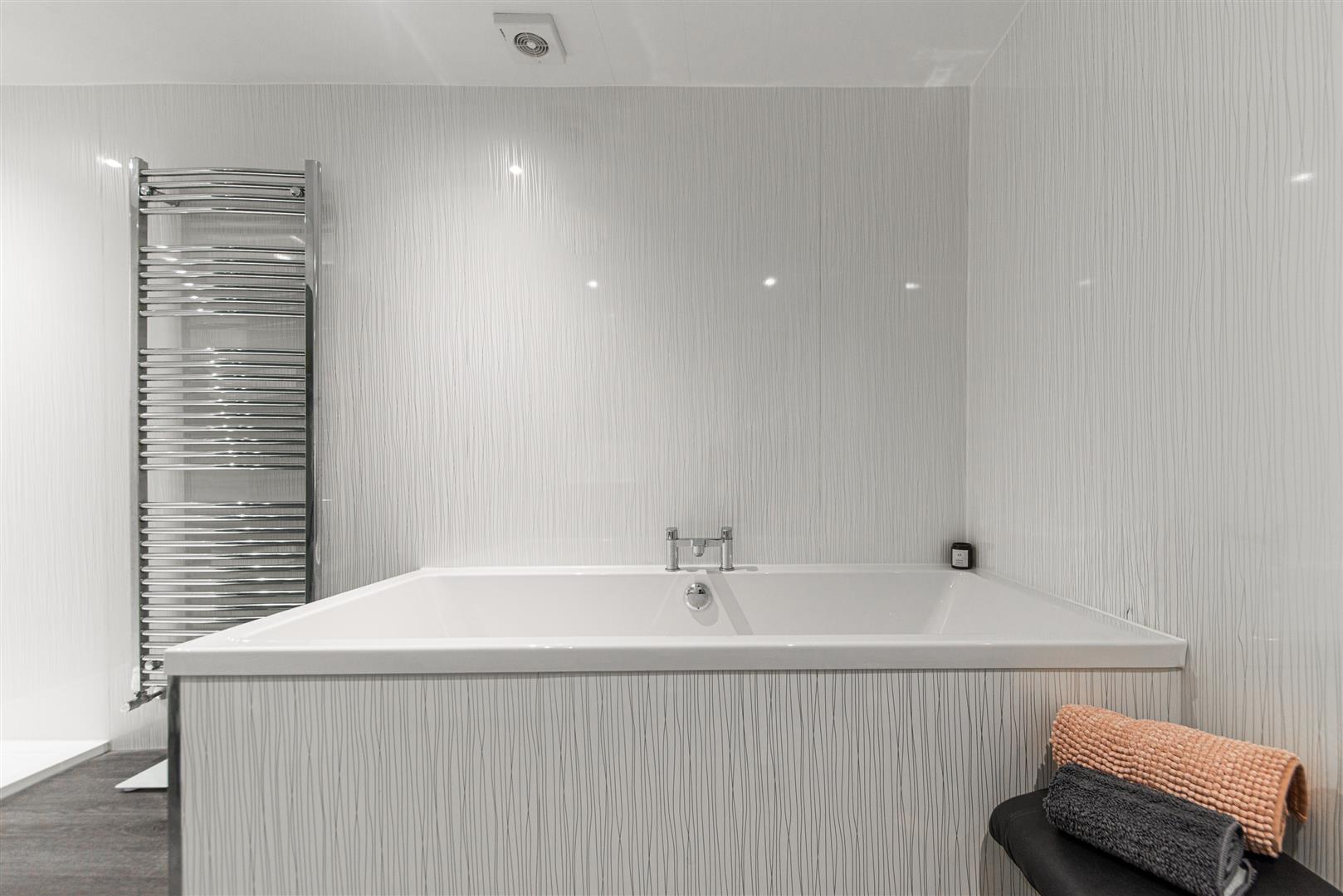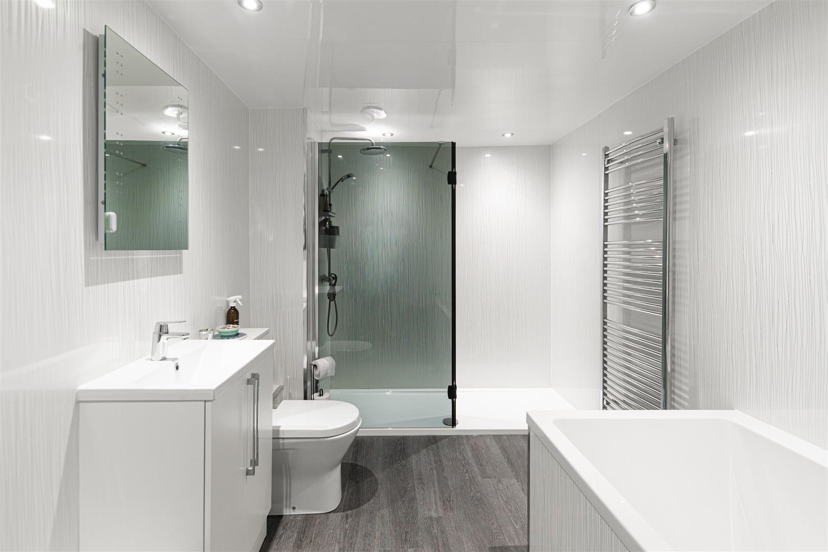 The bathroom is finished to a high standard, featuring a walk-in shower with a double shower head and a separate bathtub for relaxation.