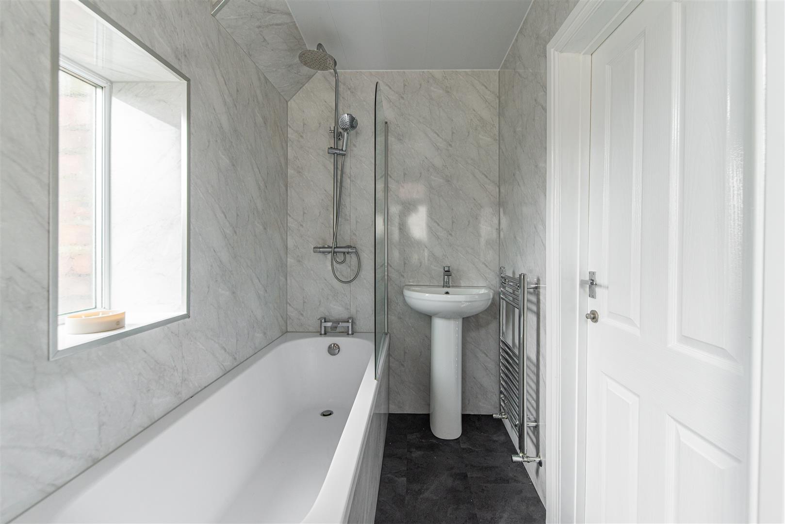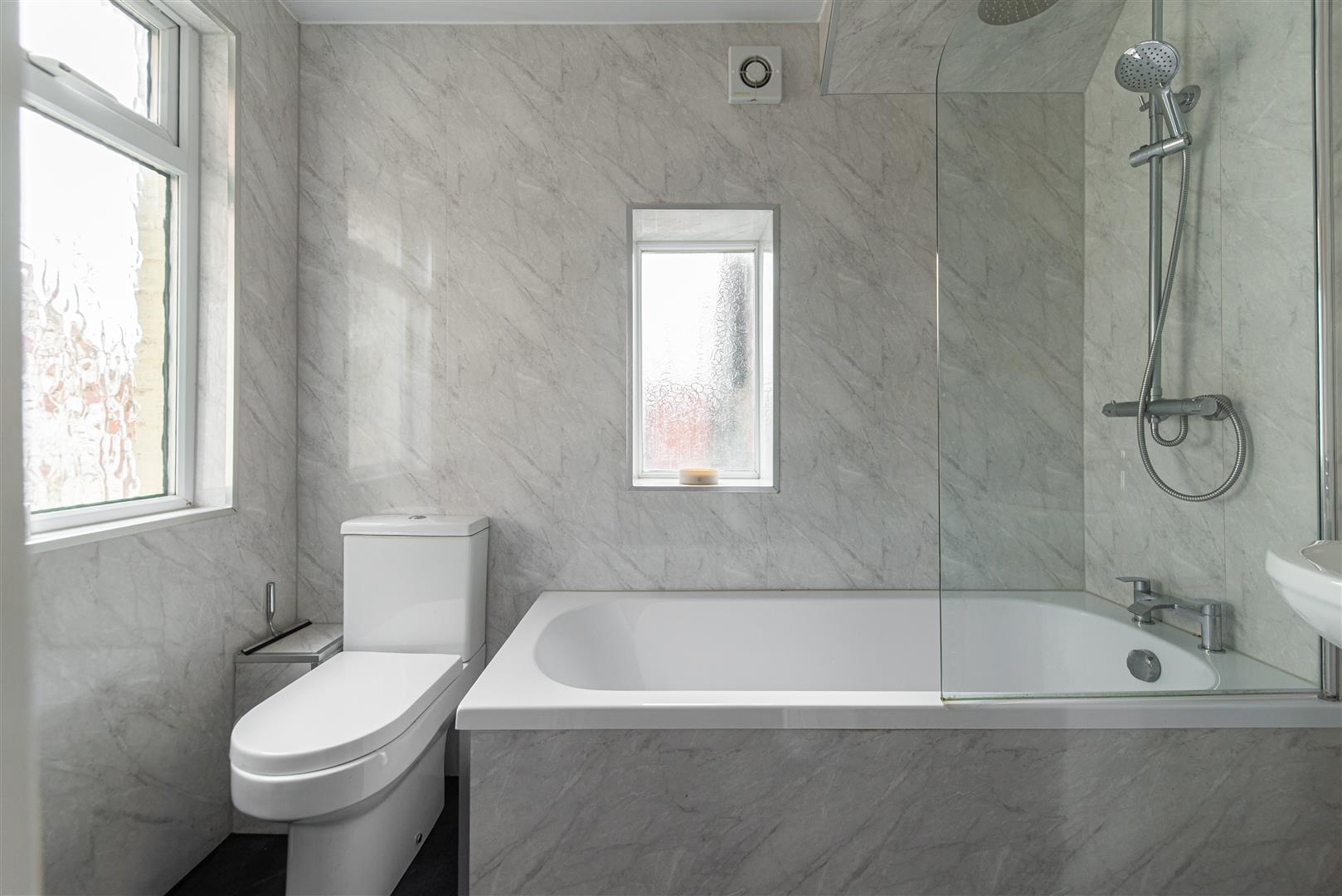 The bathroom is fitted with modern grey marble-effect cladding and comprises a shower over bath, wash basin, WC and chrome towel radiator, all finished with contemporary chrome fittings.