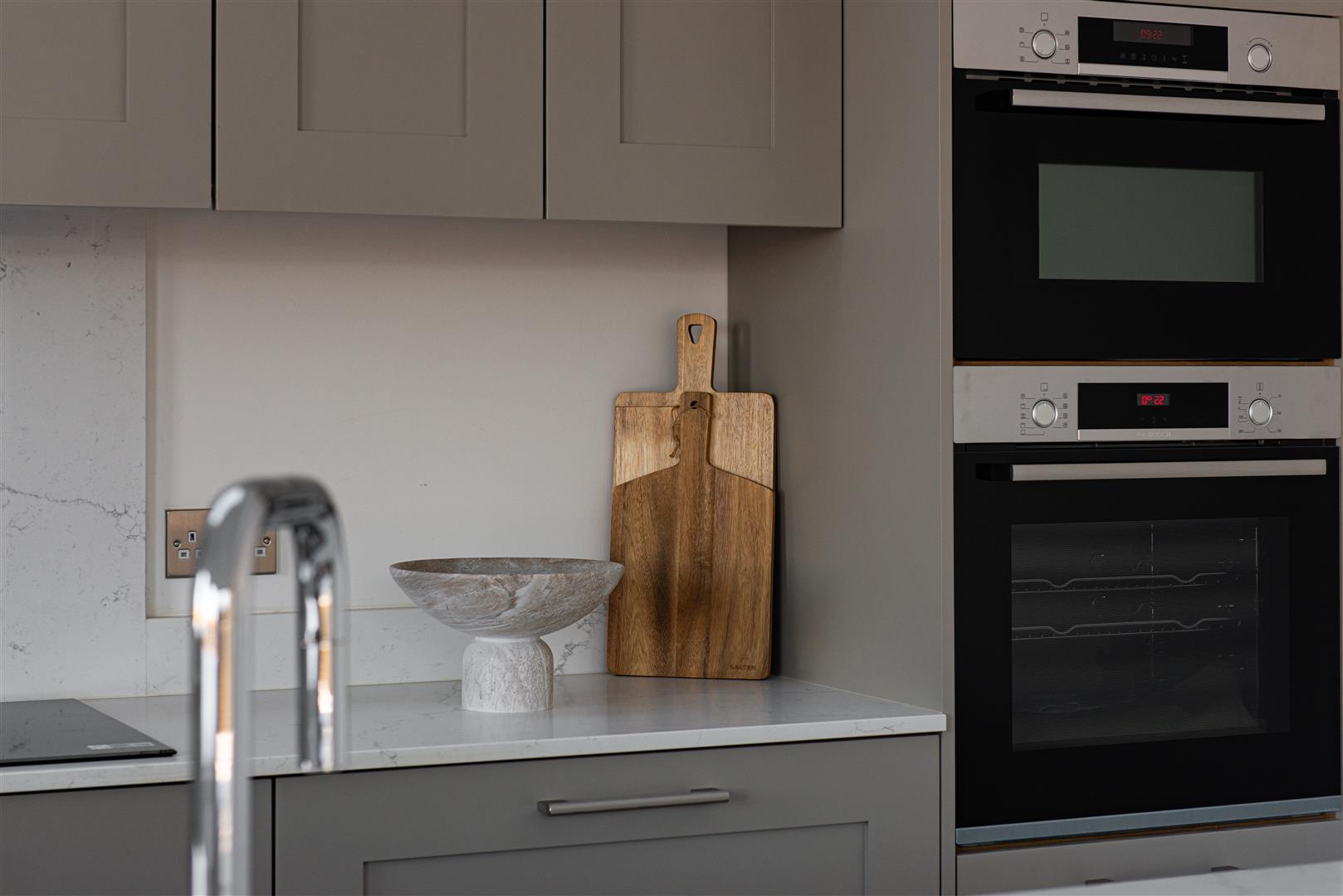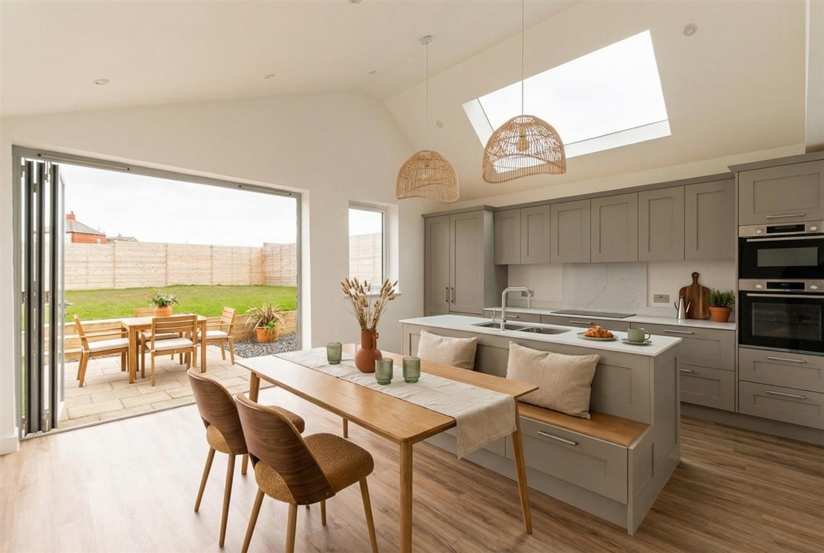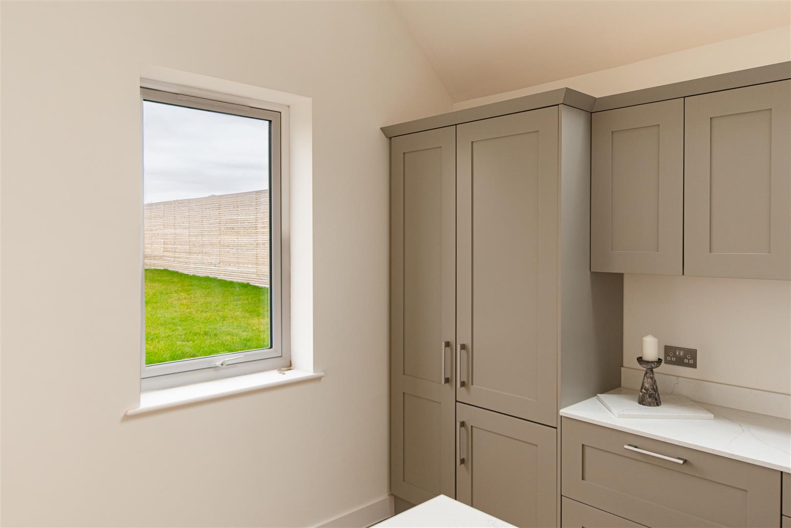 At the heart of the home is a bespoke, hand-crafted shaker-style kitchen in a muted pebble grey, finished with quartz worktops and a full suite of integrated Bosch appliances. Subtle LED lighting and oak-effect Karndean flooring run seamlessly through the kitchen, utility, and hallway, creating a cohesive, contemporary feel. A separate utility room continues the same high-quality finish, with integrated cabinetry, sink unit, and provision for stacked laundry appliances.
