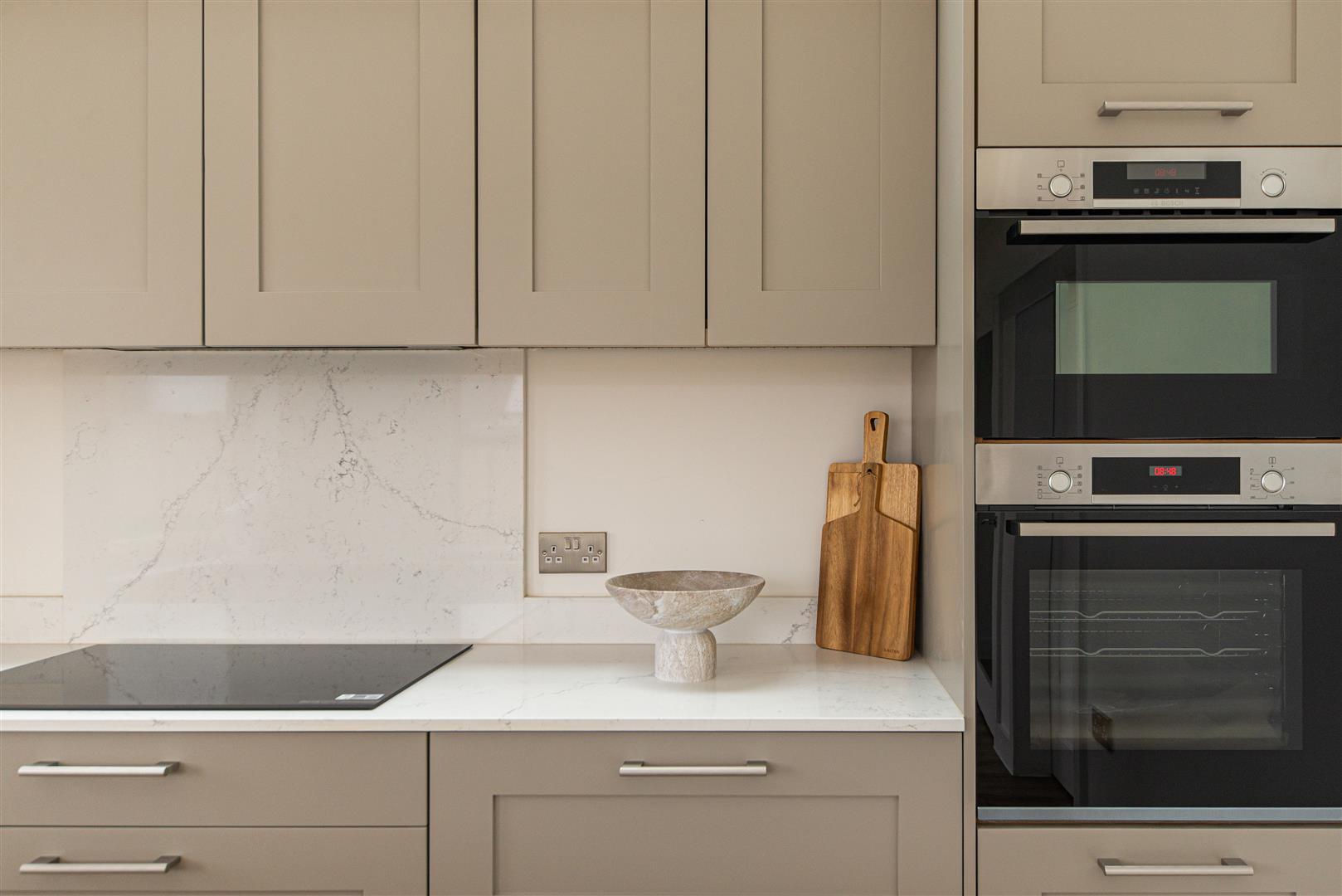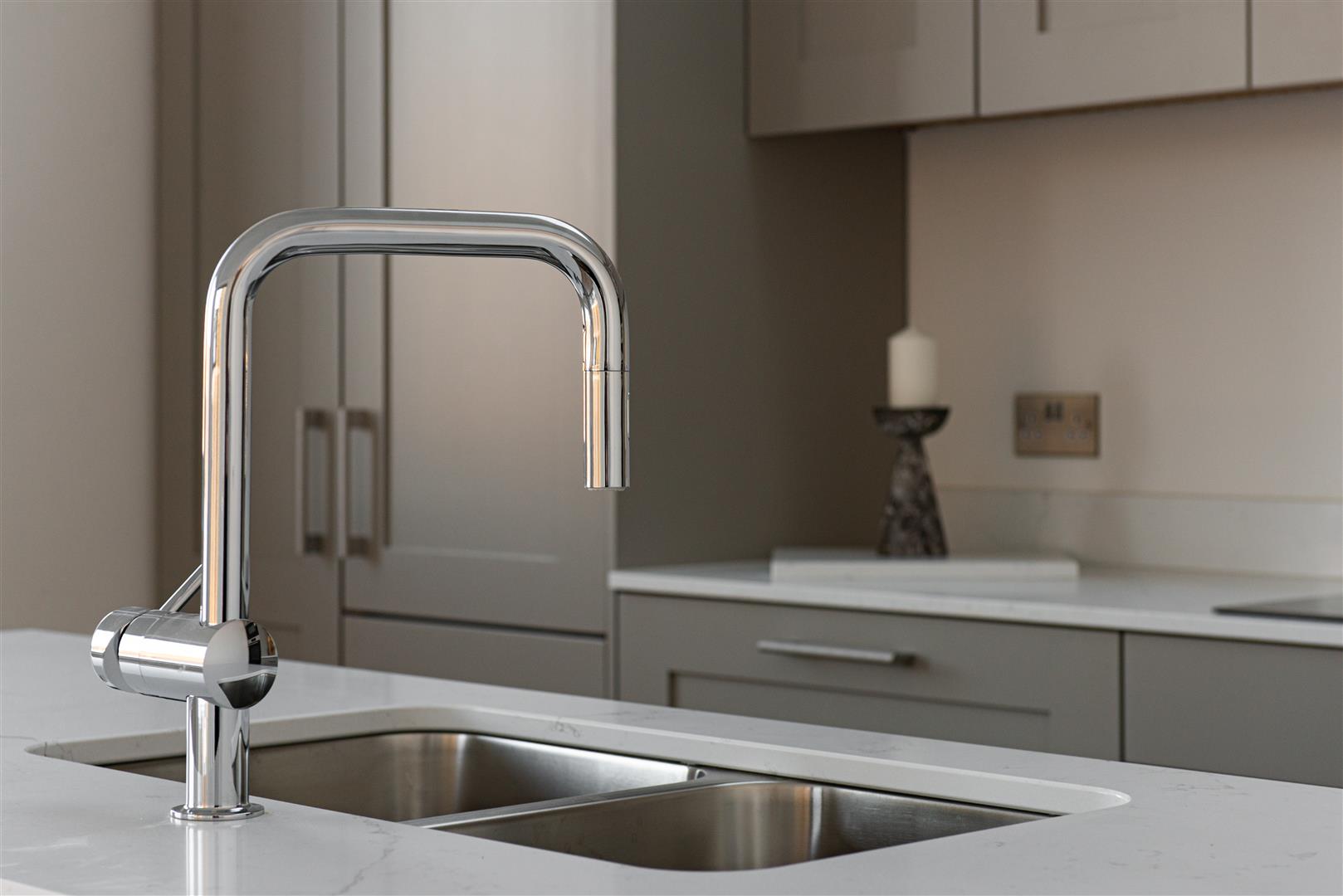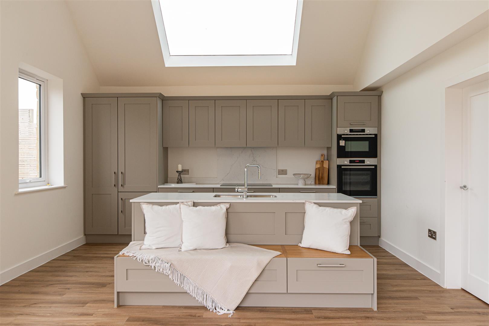 At the heart of the home is a bespoke, hand-crafted shaker-style kitchen in a muted pebble grey, finished with quartz worktops and a full suite of integrated Bosch appliances. Subtle LED lighting and oak-effect Karndean flooring run seamlessly through the kitchen, utility, and hallway, creating a cohesive, contemporary feel. A separate utility room continues the same high-quality finish, with integrated cabinetry, sink unit, and provision for stacked laundry appliances.