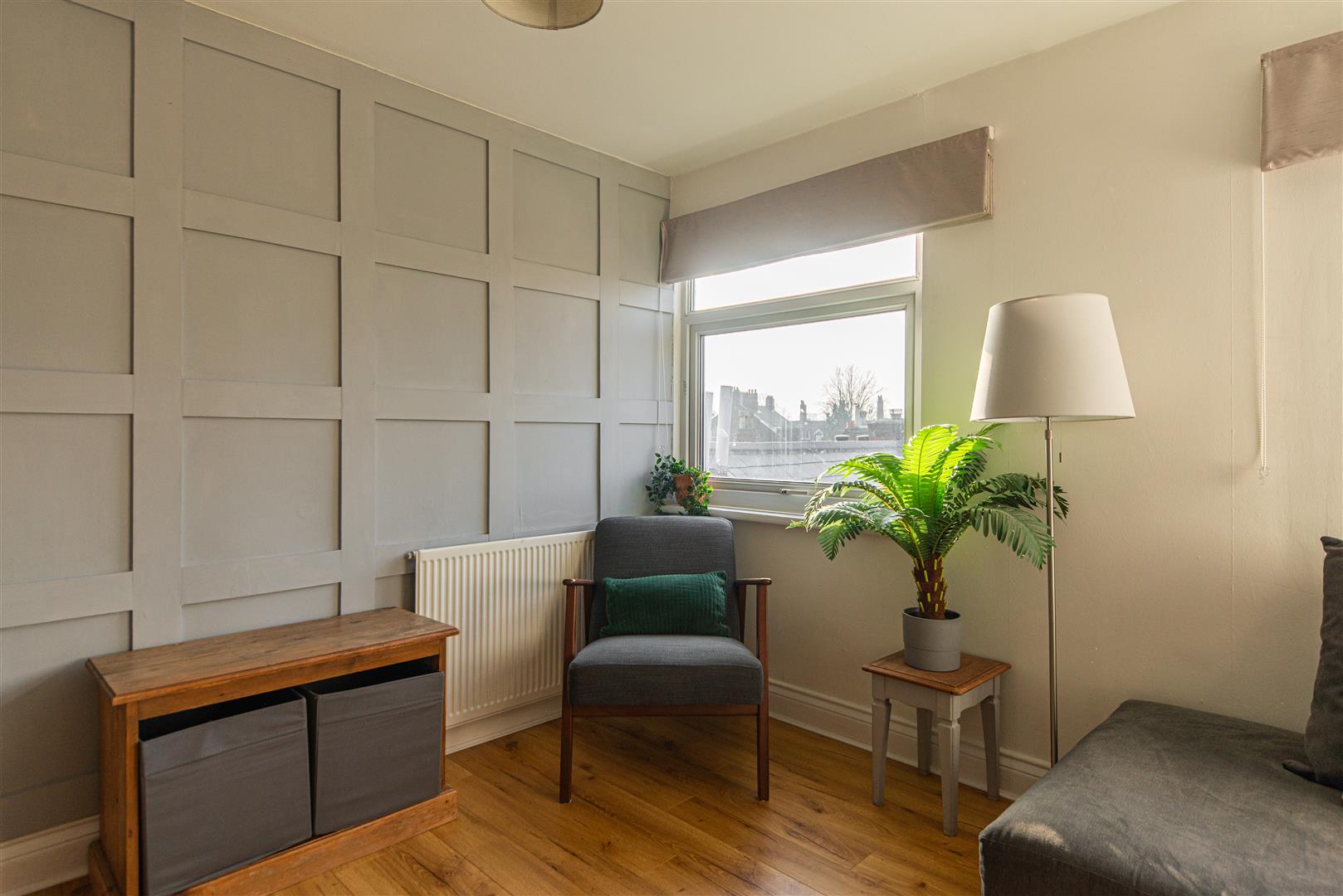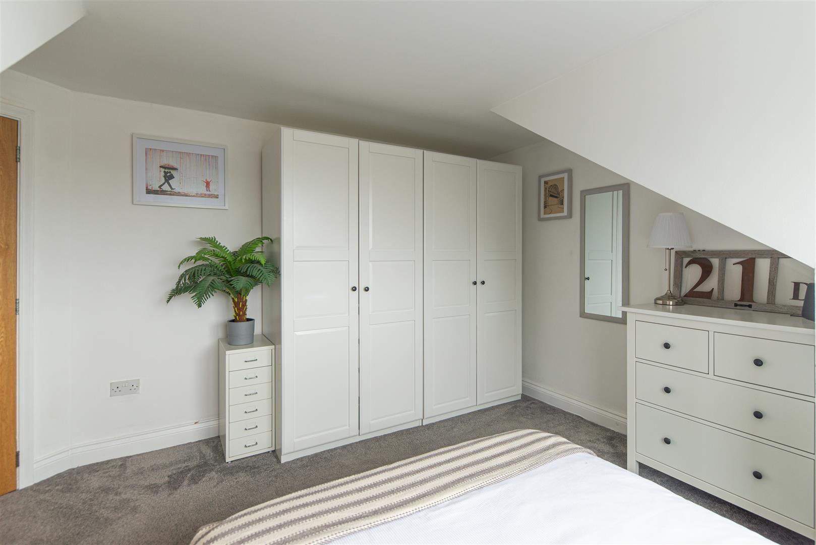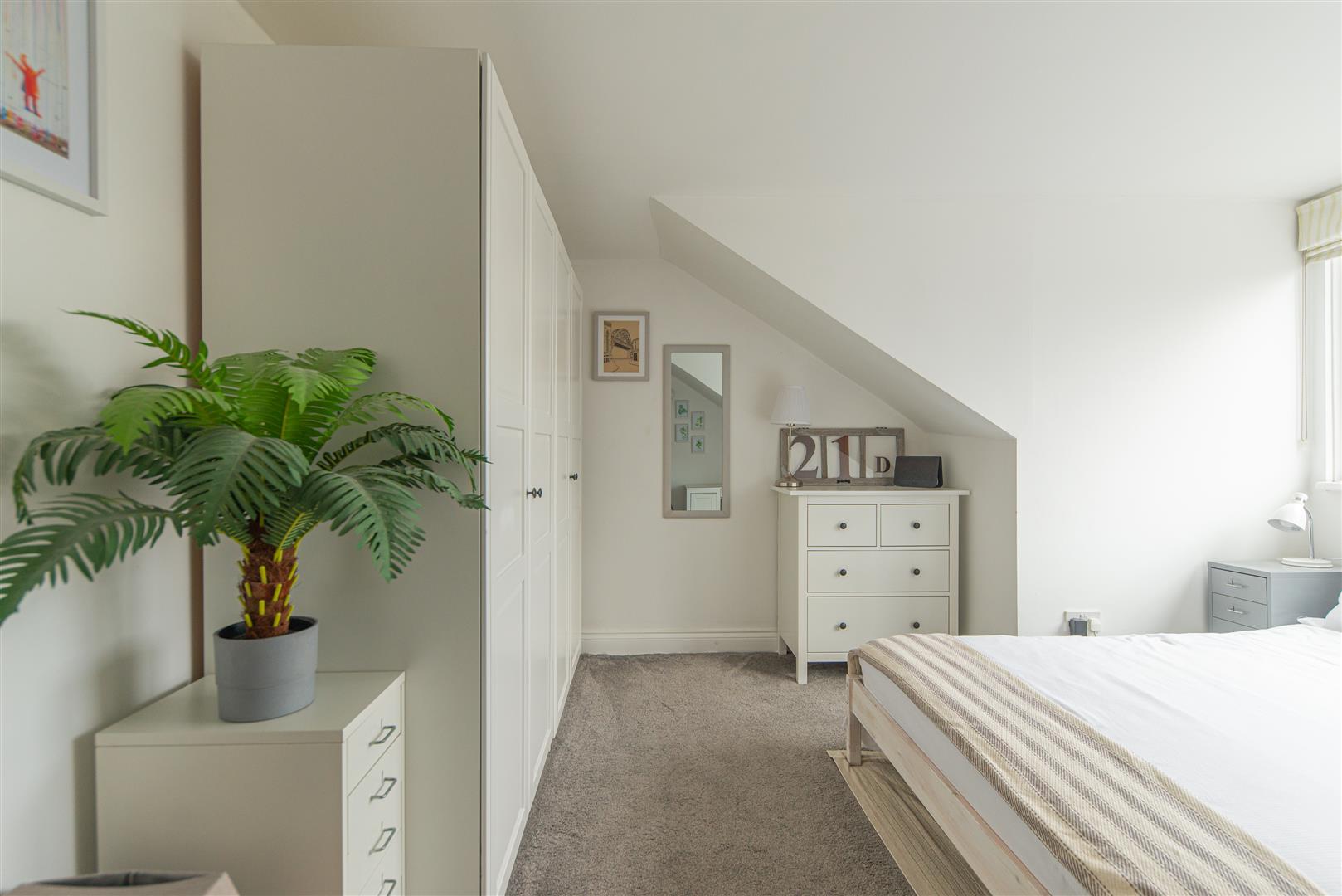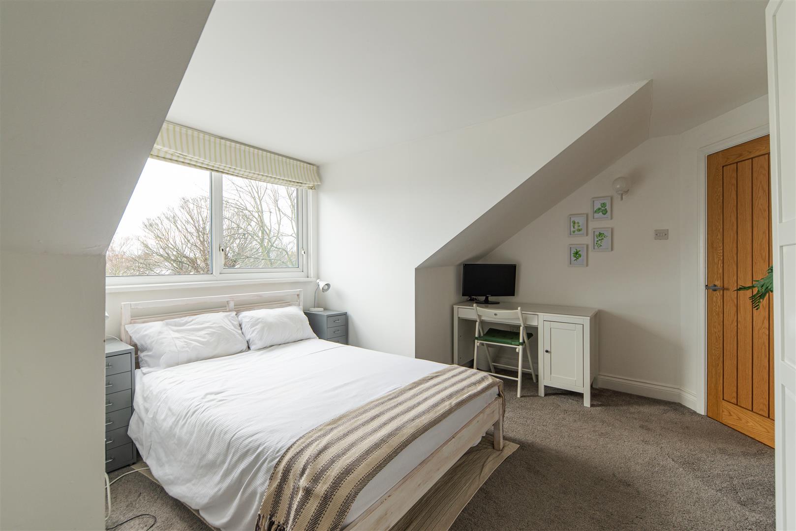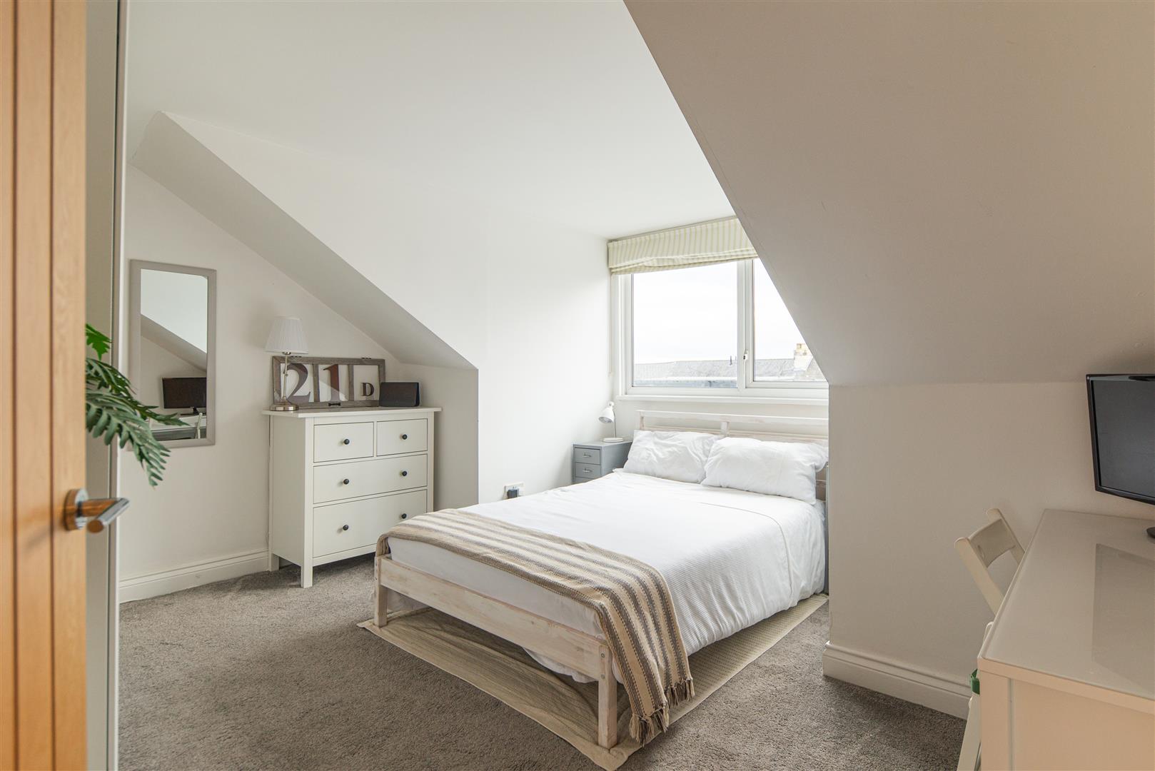 The generously sized double bedroom continues the calm neutral theme and benefits from soft grey carpeting and a charming dormer window that fills the room with natural light. There is ample space for wardrobes, additional storage and a dedicated workspace if required.