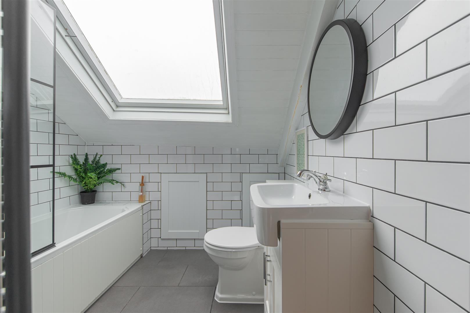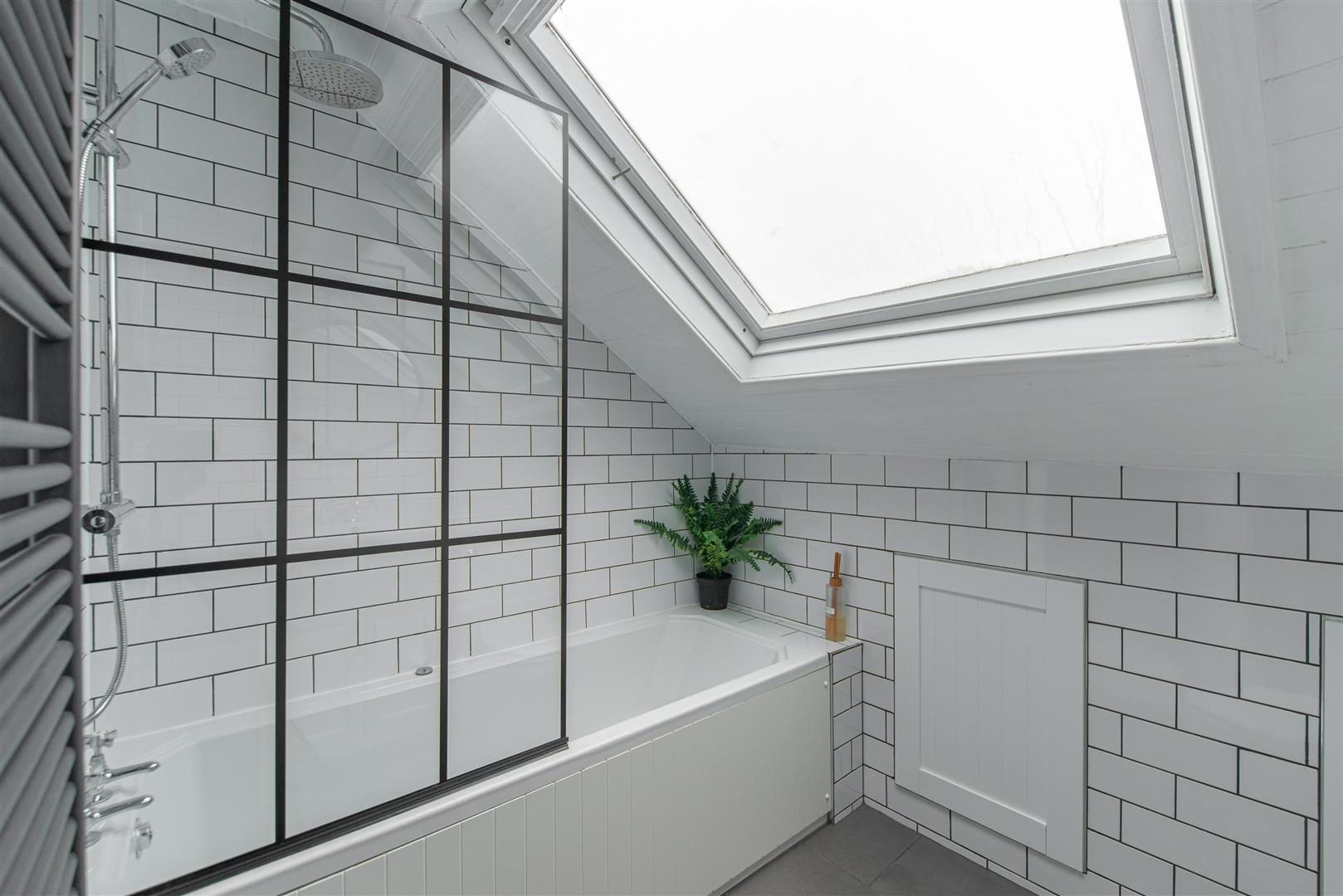 The bathroom is finished in a timeless combination of white metro wall tiles and grey floor tiles and comprises a shower over bath with a sleek black crittall-style glass screen, vanity basin unit, WC and heated towel radiator, completing the home to a high standard.