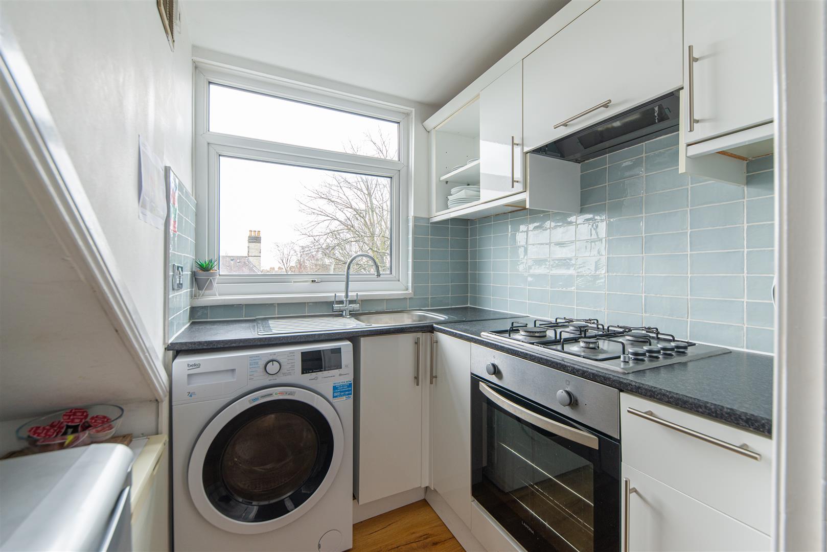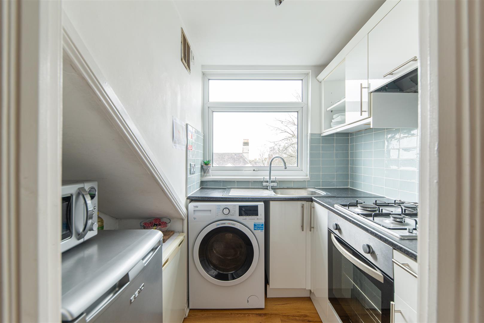 The kitchen has contemporary styling, featuring high-gloss white cabinetry, grey laminate worktops and a sea-blue tiled splashback. An integrated oven and gas hob are in place, with additional space available for freestanding appliances, offering both style and functionality.