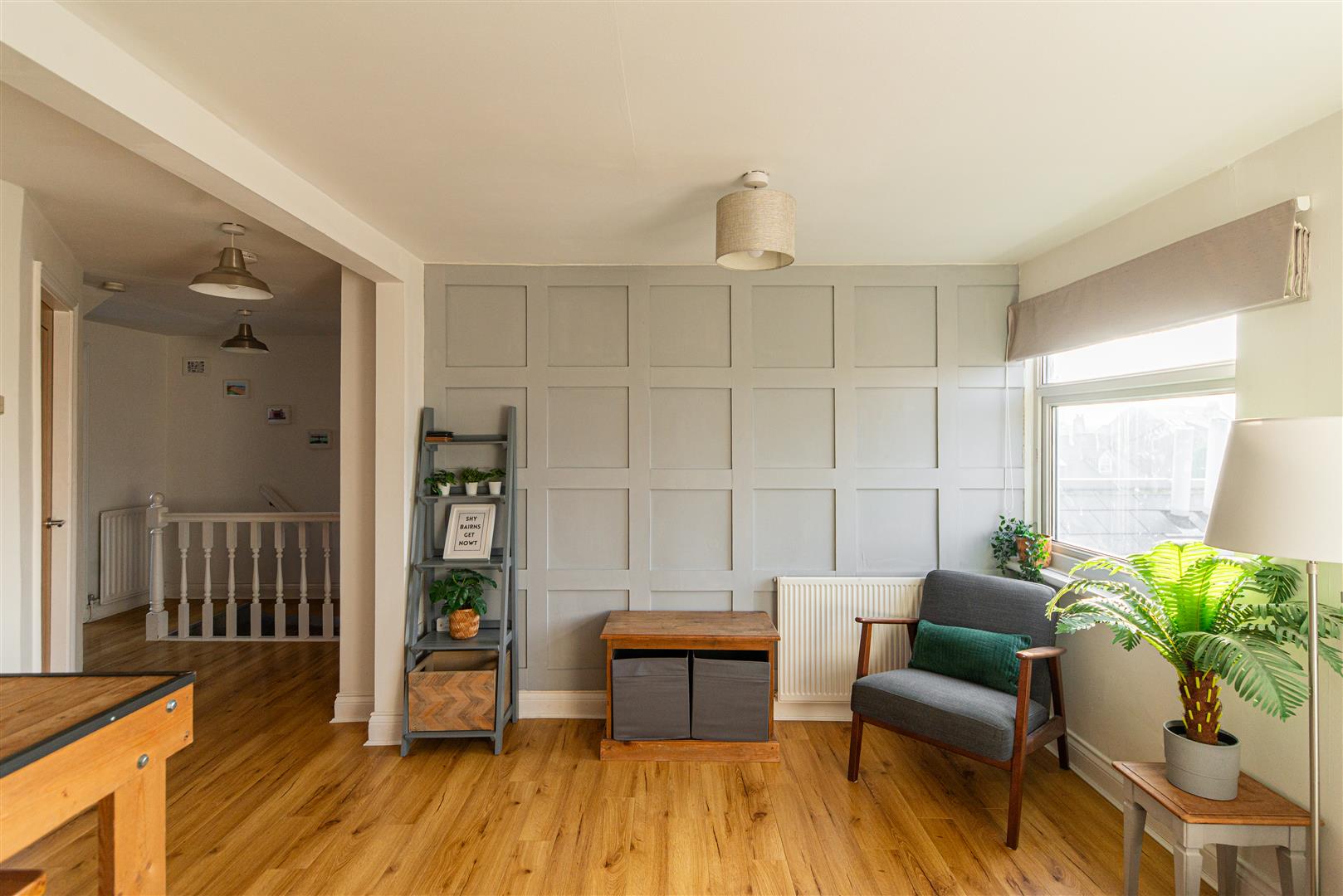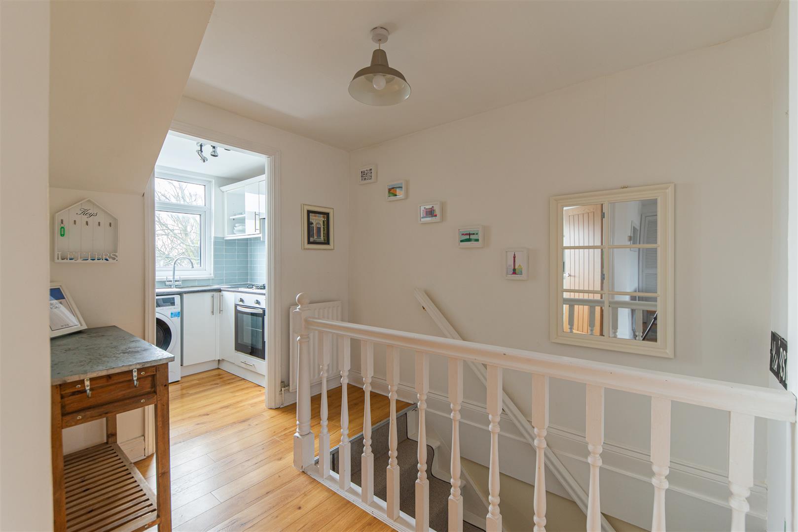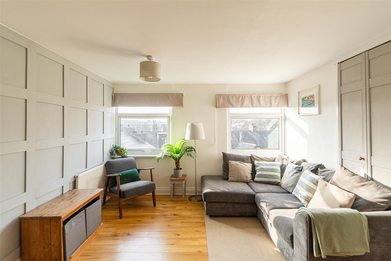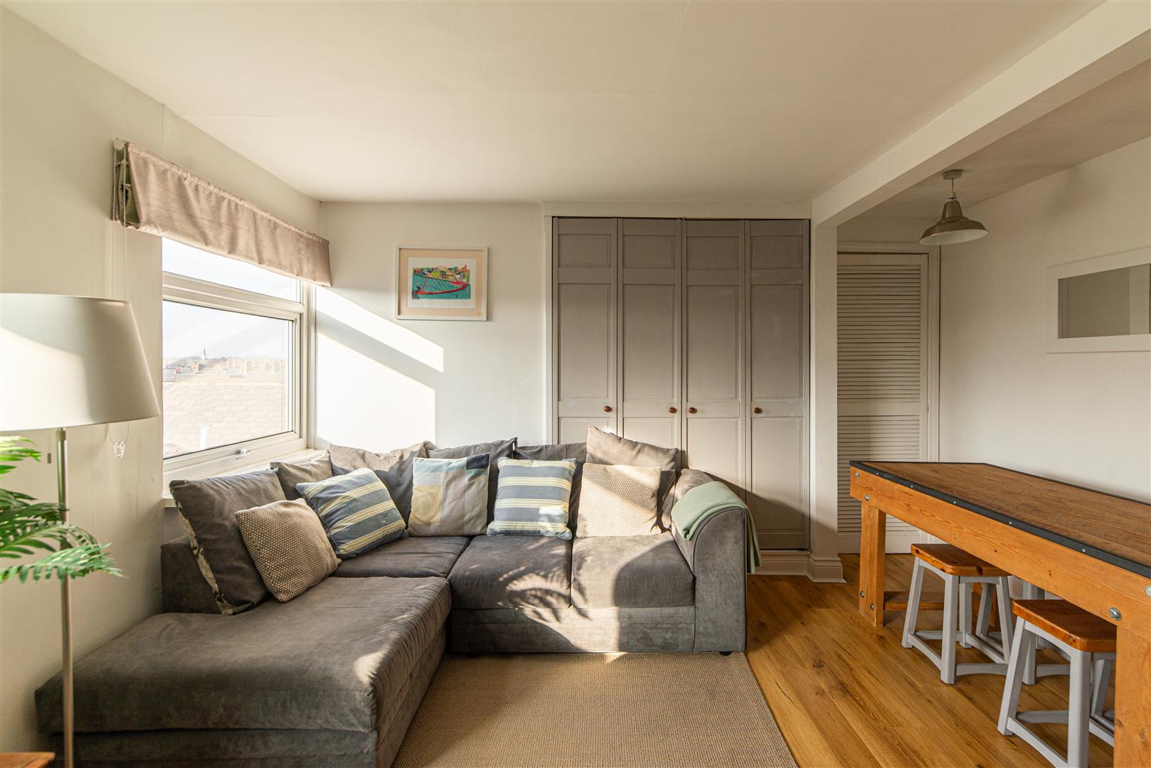 The apartment opens onto a private landing and staircase with a fitted runner, leading up to an impressive open-plan lounge and dining area, thoughtfully extended to create a superb social space ideal for both everyday living and entertaining. Large windows provide views across the rooftops to the west and flood the room with natural light, complementing the neutral décor and feature wall, with oak-style flooring adding warmth and character. Built-in storage cupboards provide practical convenience without compromising the clean aesthetic.