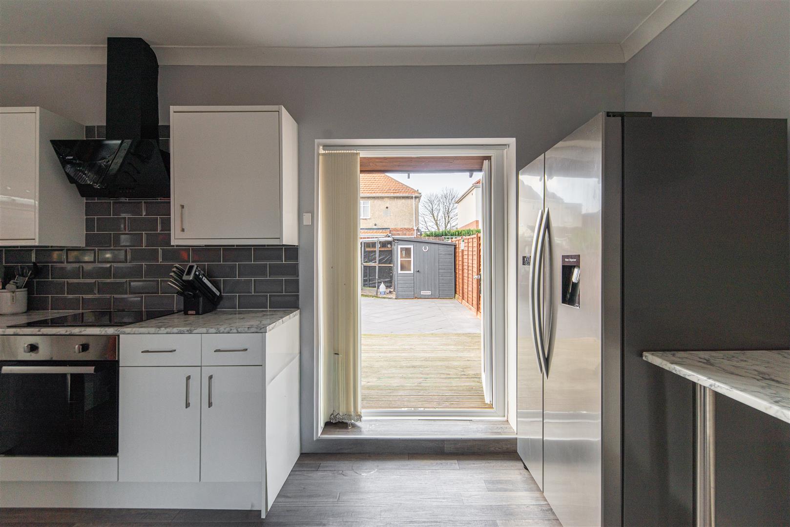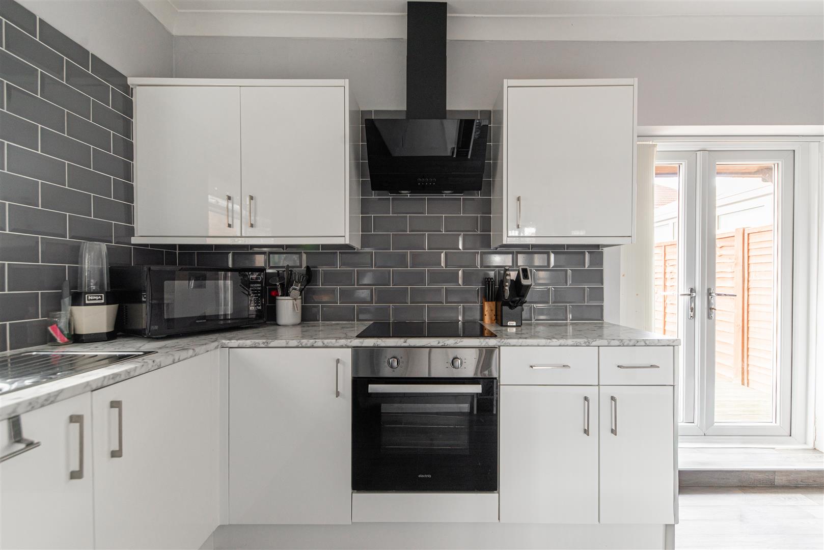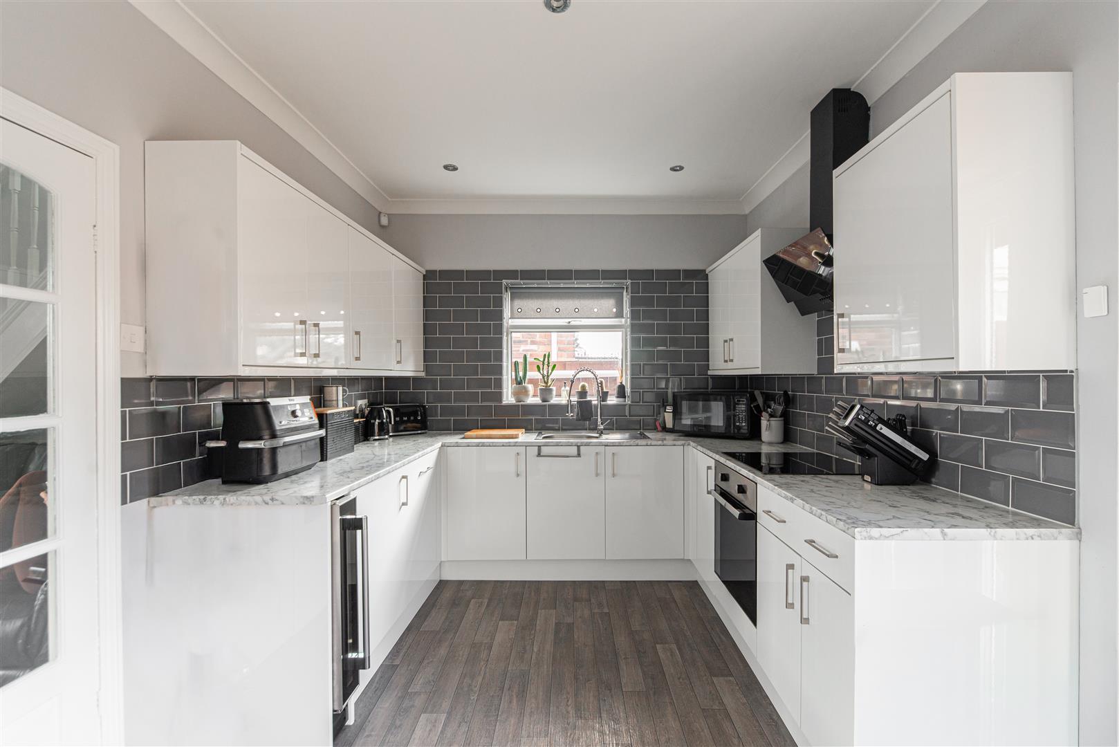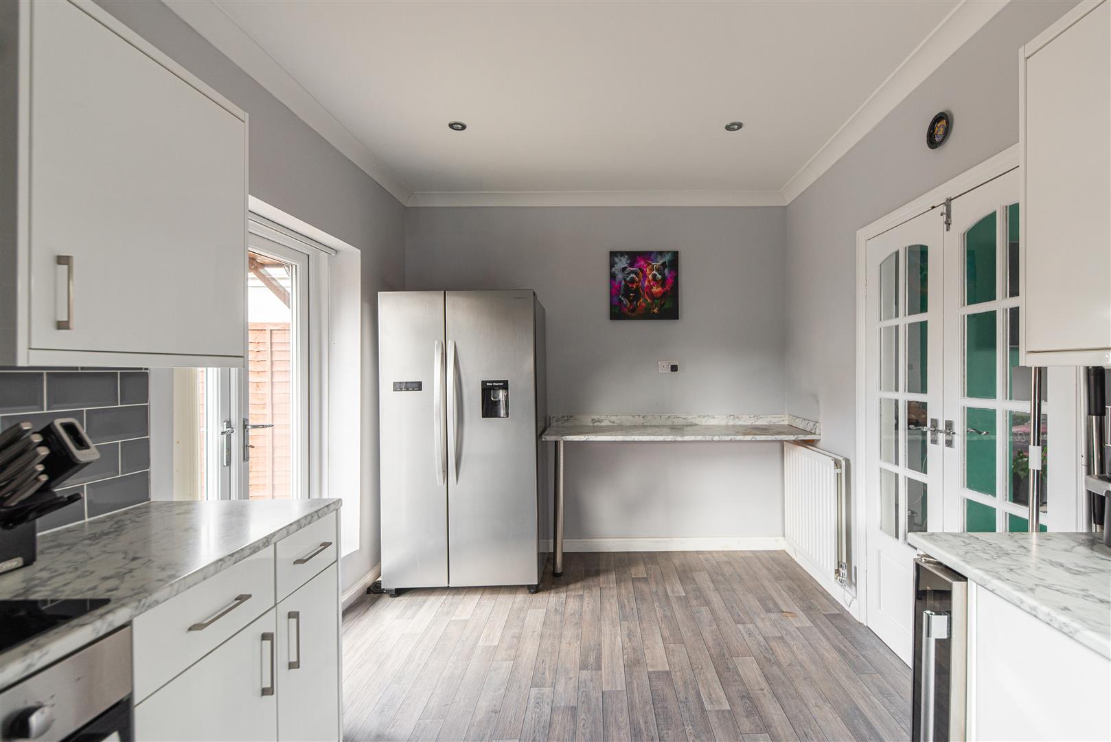 The modern kitchen is fitted with white high gloss cabinets, marble effect worktops, grey metro tile splashback and grey wood effect laminate flooring. Integrated appliances include an oven, hob, wine fridge and dishwasher. There is plenty of room for a dining table, while French doors open out onto the rear garden, allowing plenty of natural light to fill the space.