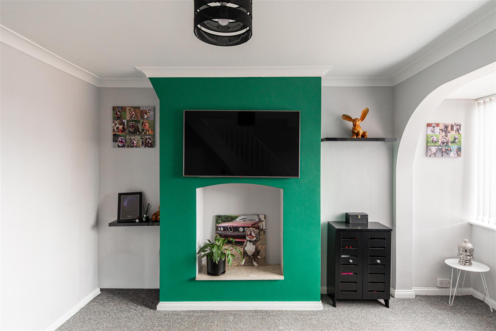 - Bright living room with feature fire breast and storage