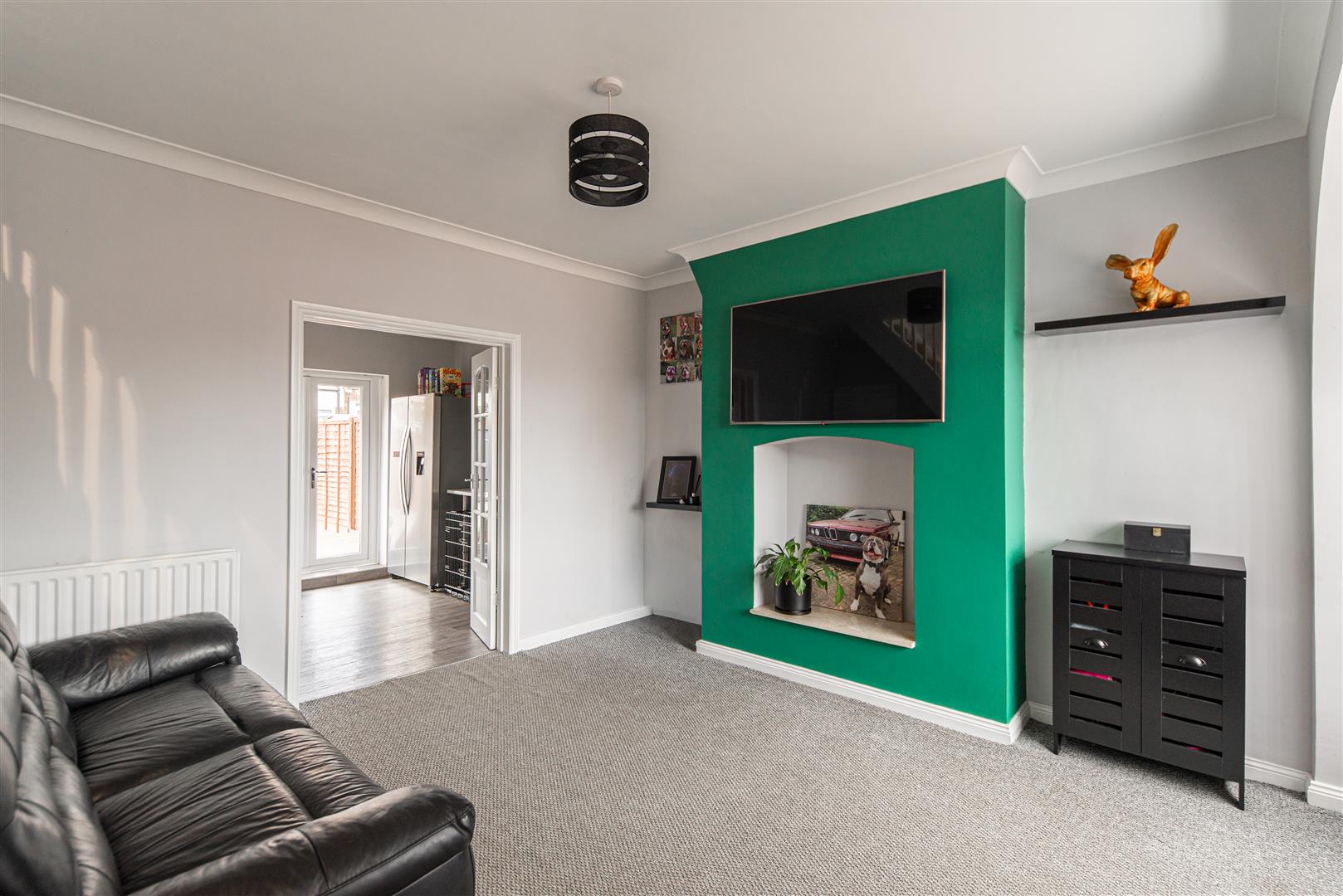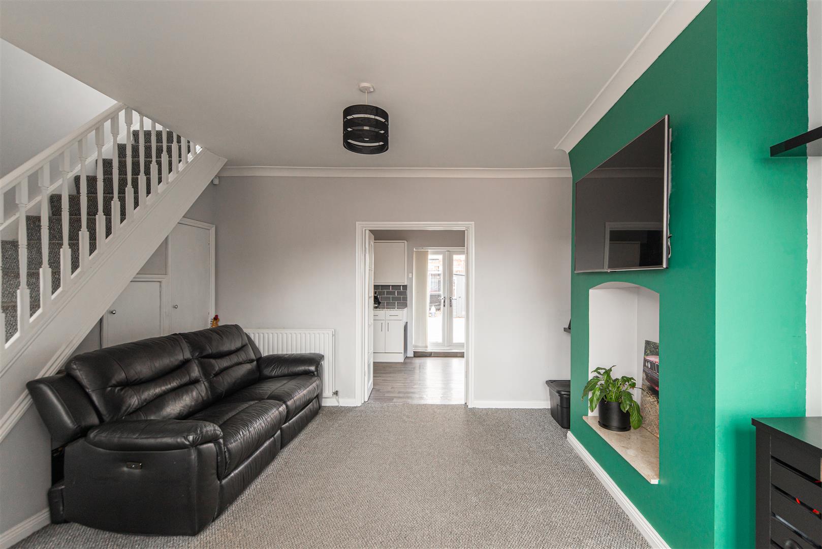 Upon entering the property, the bright and welcoming living room sits at the front of the home and is filled with natural light from the large windows. The room features neutral carpets, a feature fire wall and useful under-stair storage cupboards, creating a comfortable and practical living space. Double doors lead through to the spacious kitchen and dining area, which provides a fantastic space for both everyday living and entertaining.