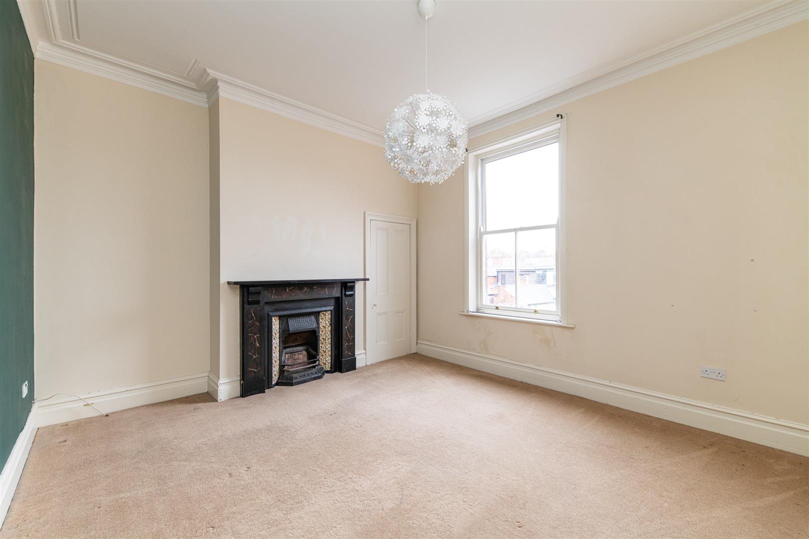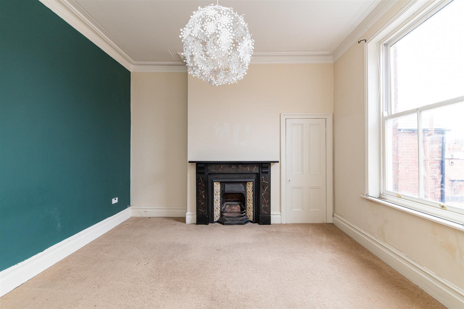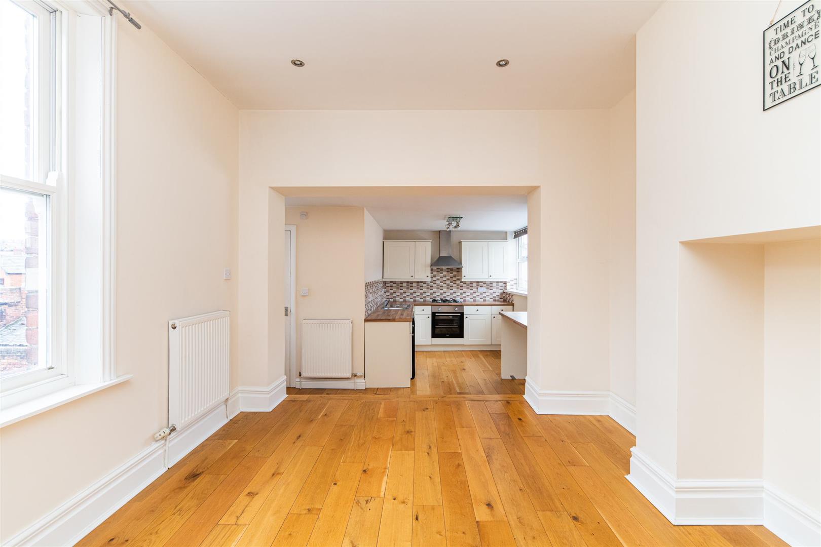 Internally, the flat offers a unique and well-proportioned layout, with attractive wooden flooring running throughout much of the space. The living room is particularly generous in size, providing ample space for both lounge and additional furnishings. It features a stylish statement wall and a charming fireplace, creating a focal point within the room while enhancing the overall sense of character and warmth. The proportions and layout make it an ideal space for both relaxing and entertaining.
