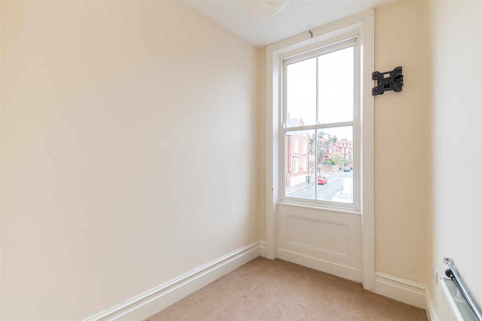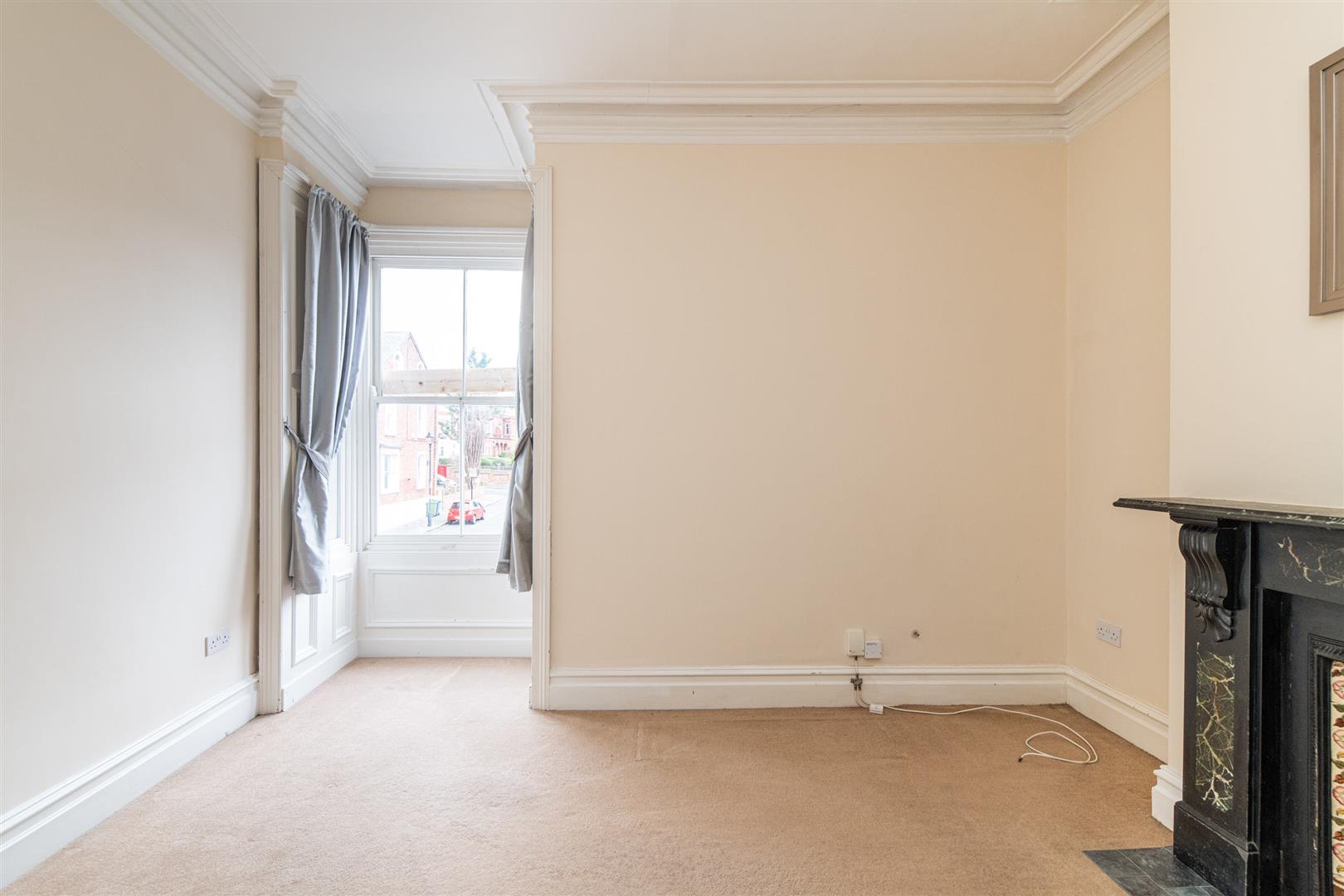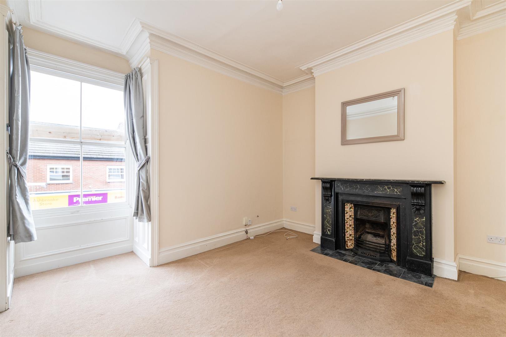 Internally, the flat offers a unique and well-proportioned layout, with attractive wooden flooring running throughout much of the space. The living room is particularly generous in size, providing ample space for both lounge and additional furnishings. It features a stylish statement wall and a charming fireplace, creating a focal point within the room while enhancing the overall sense of character and warmth. The proportions and layout make it an ideal space for both relaxing and entertaining.
