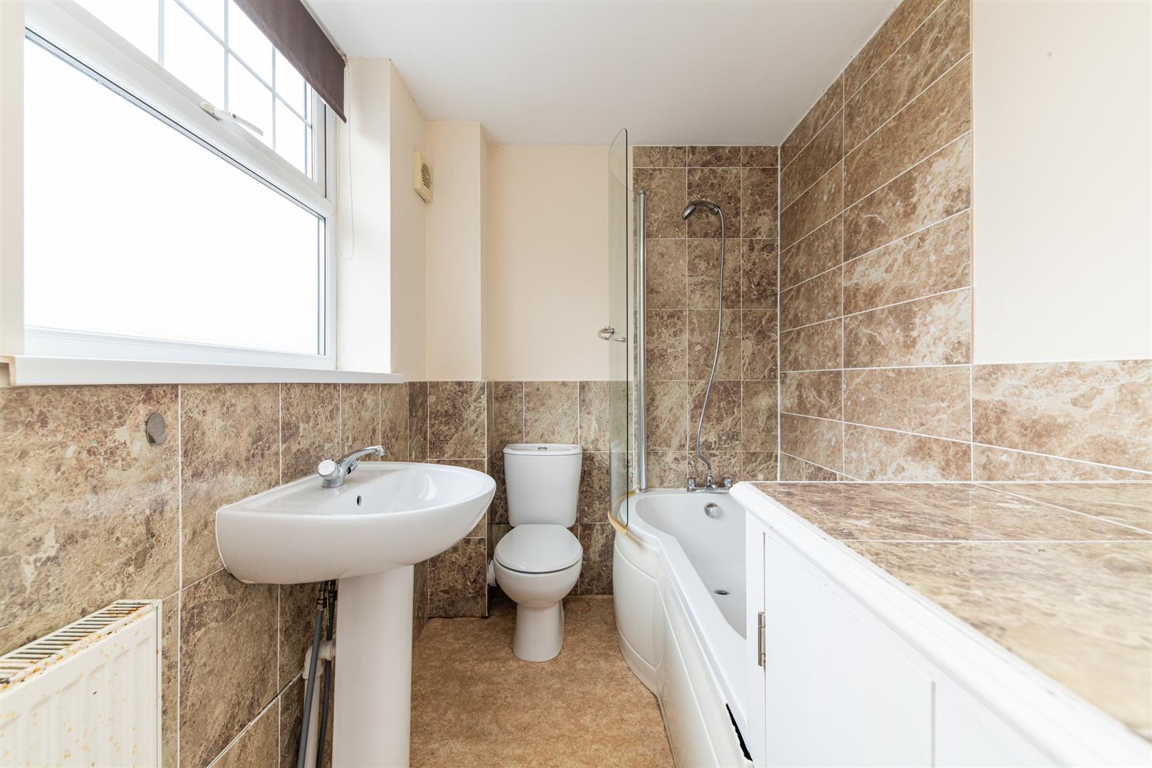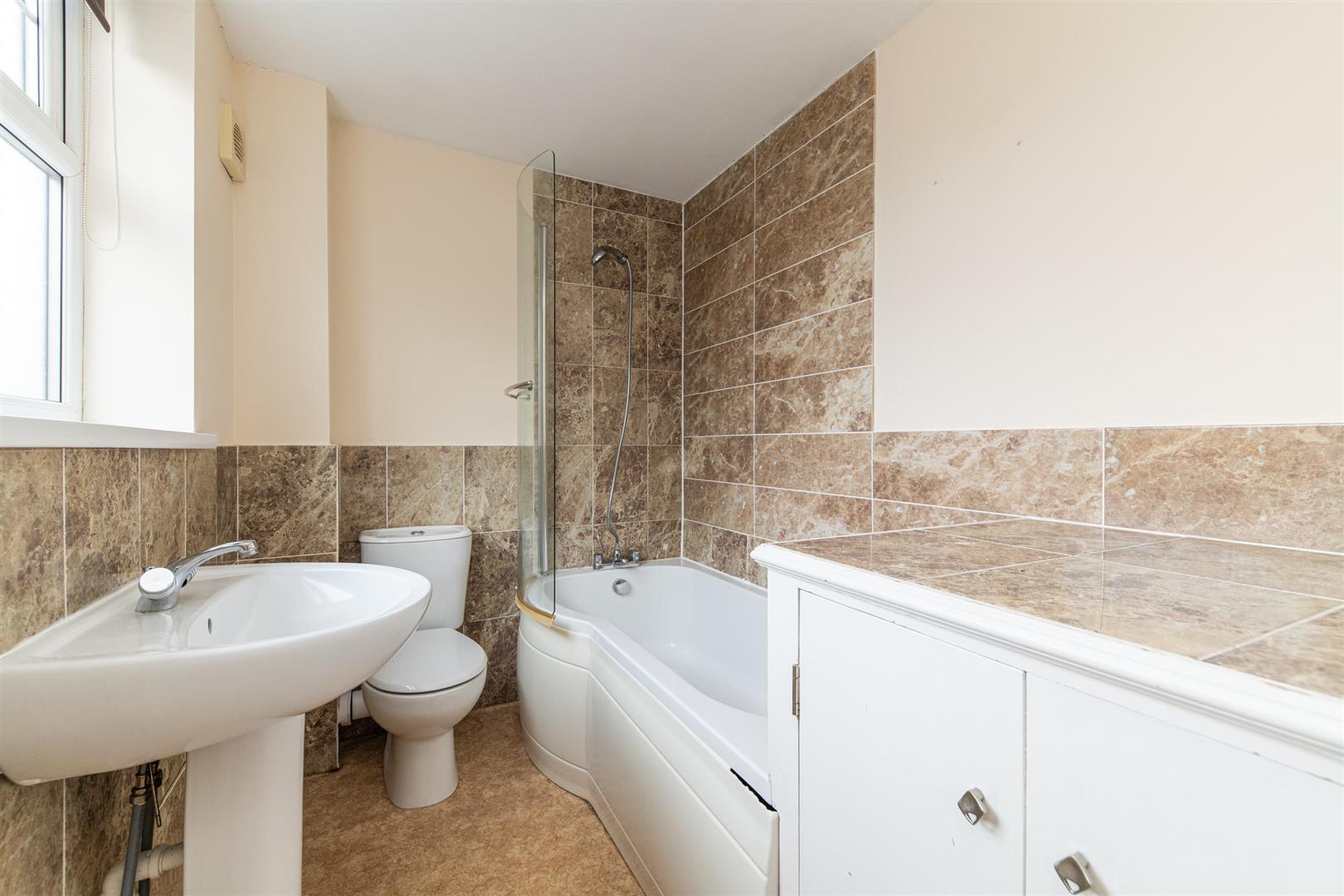 The bathroom is finished with neutral tiling and offers a light, airy feel, comprising a shower over bath, wash basin, and WC.